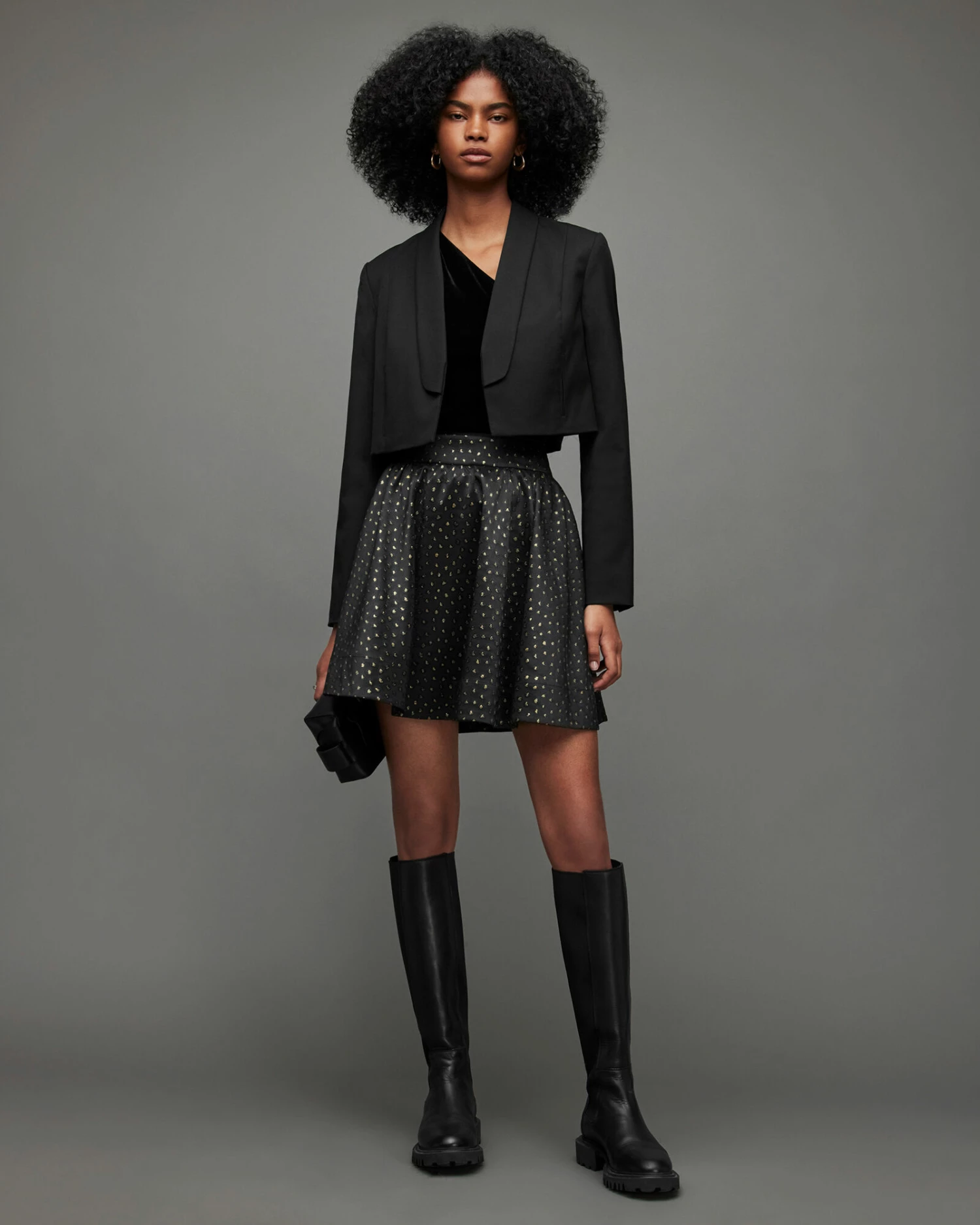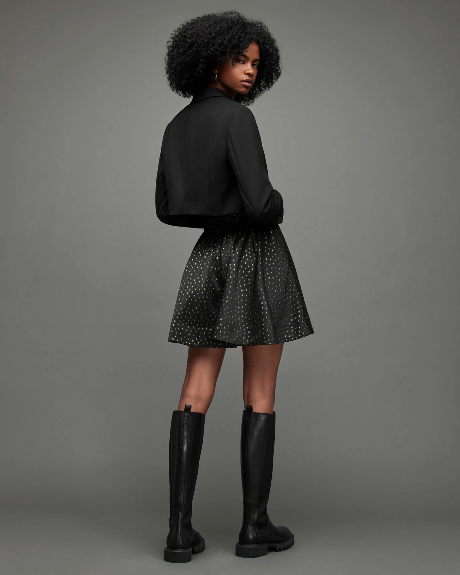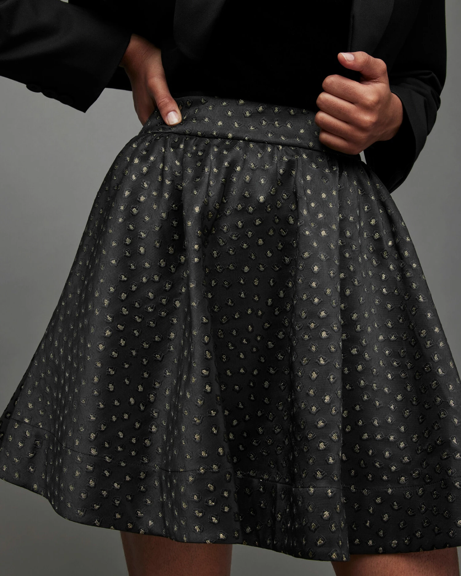 Take a shine to the Aimsie Skirt. A mini dress with a gathered waistband and volumous skirt. This evening piece has a shimmer running through it.