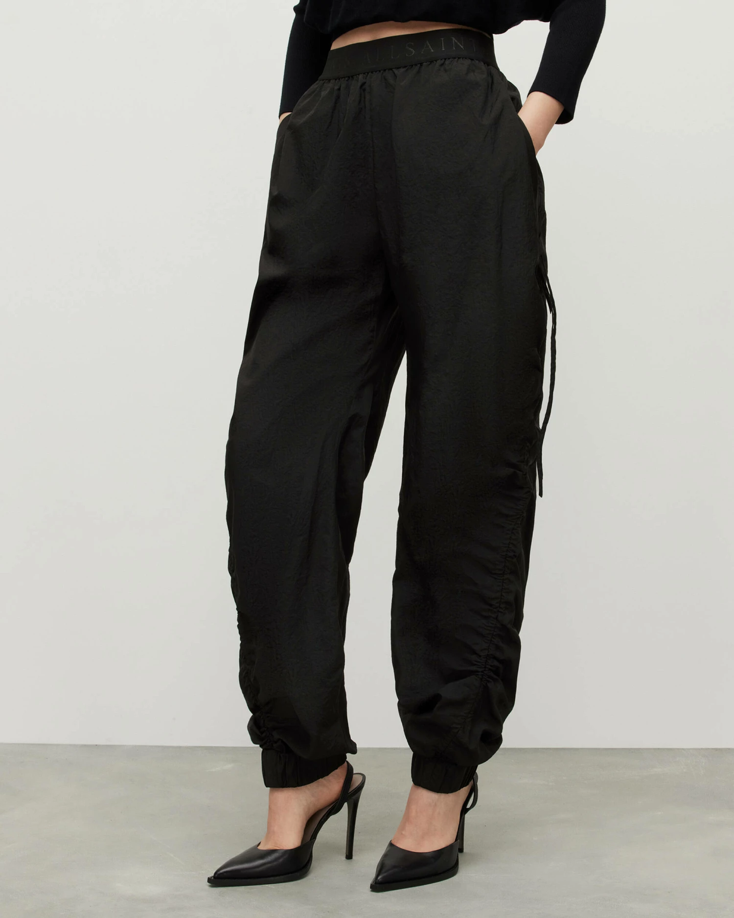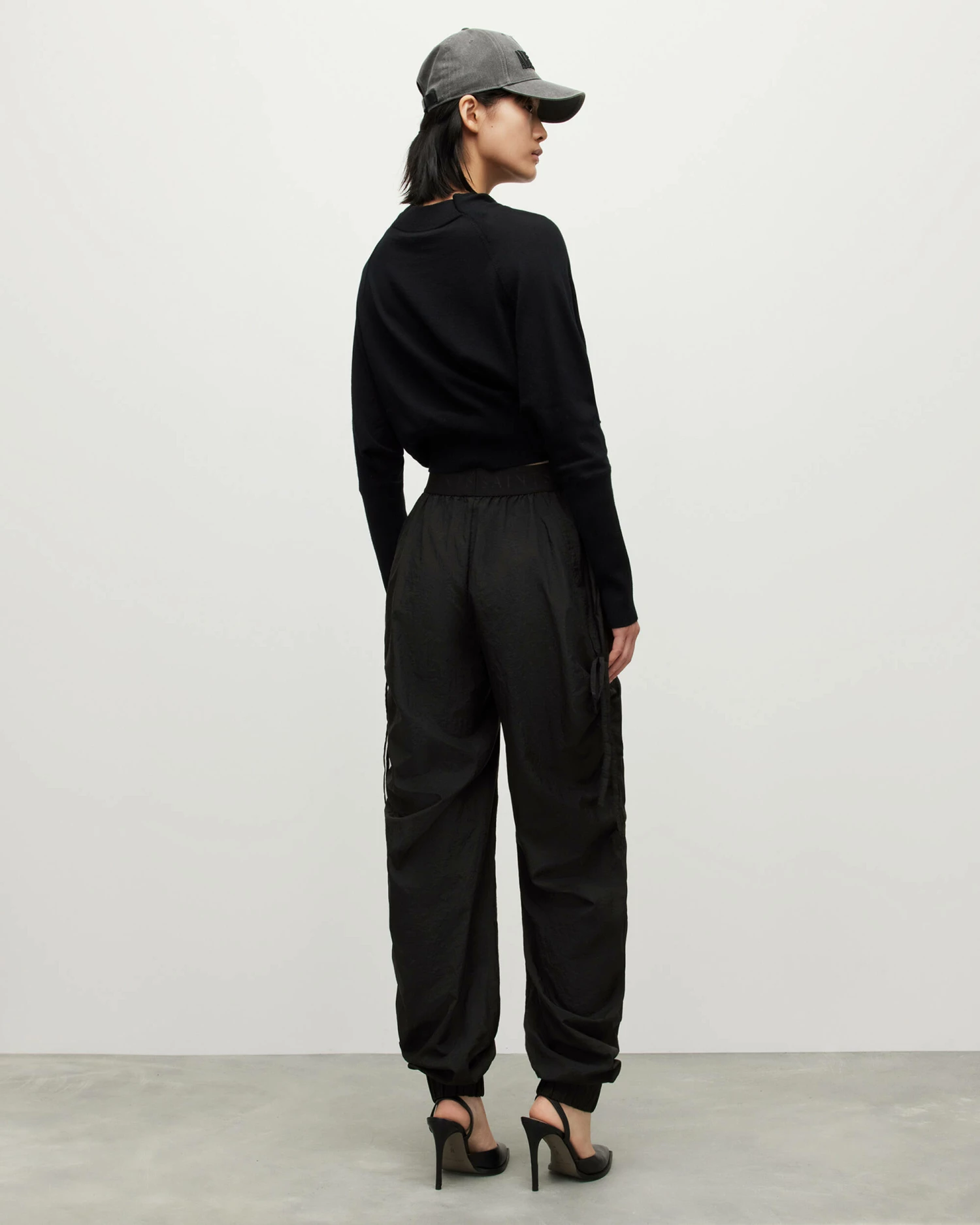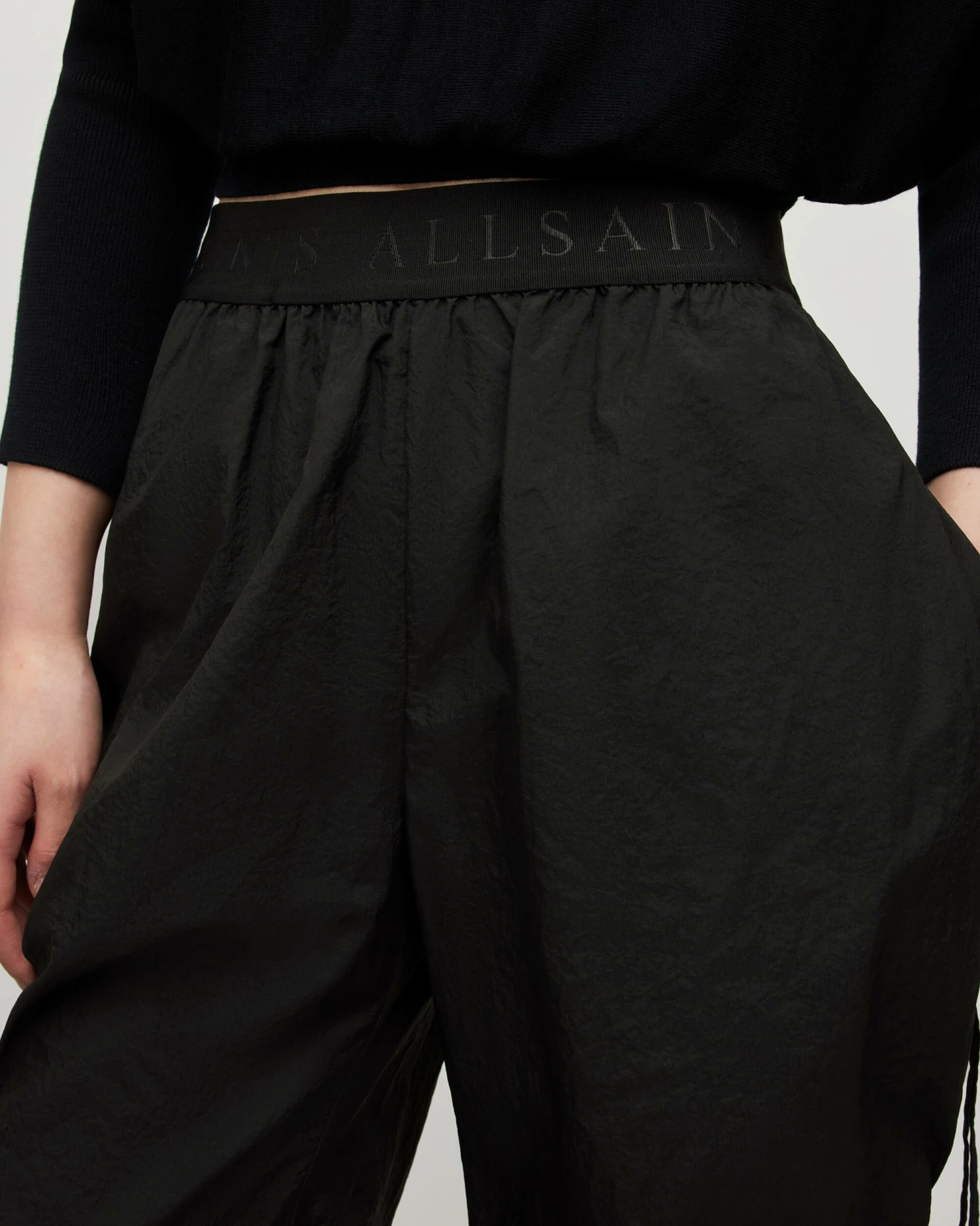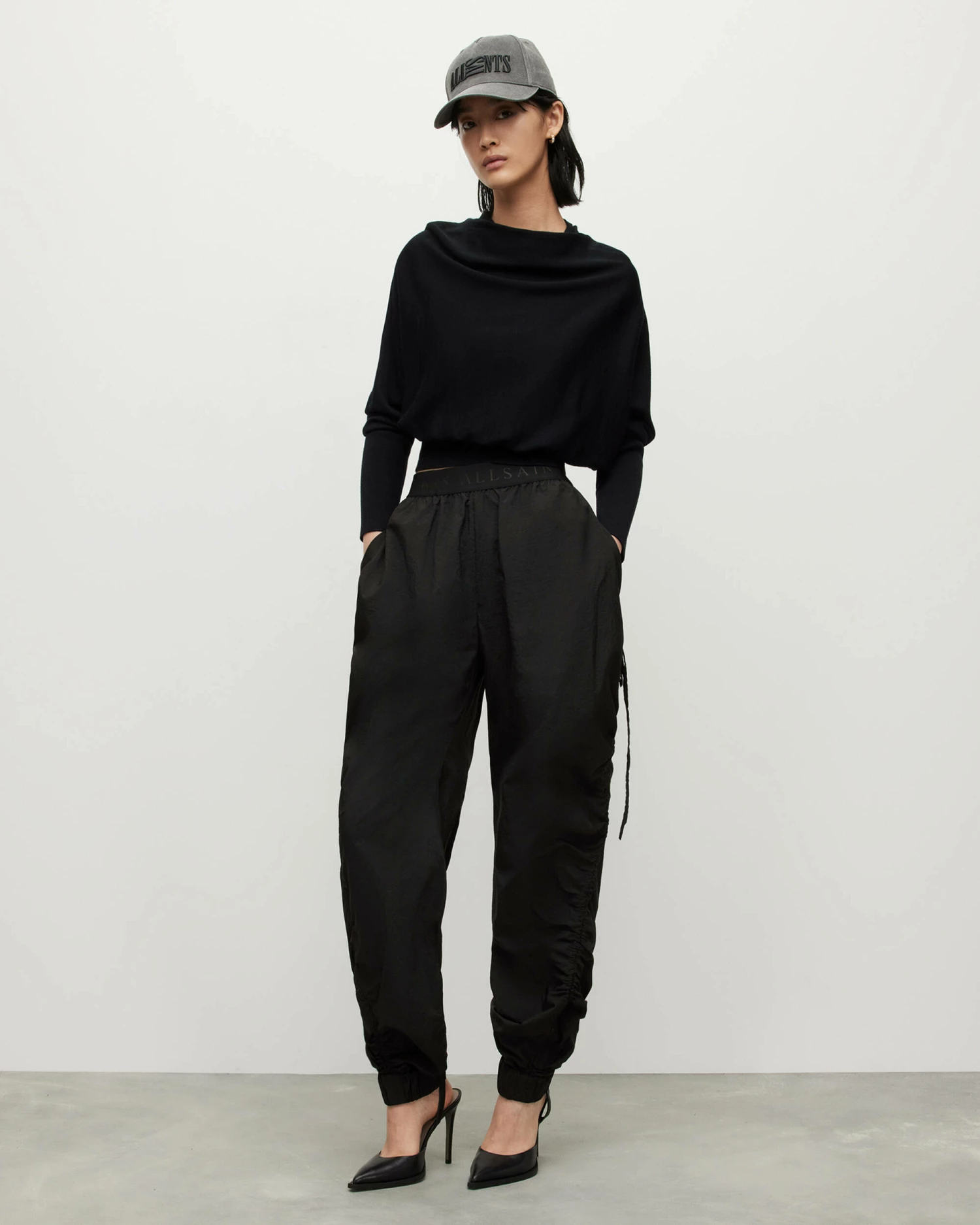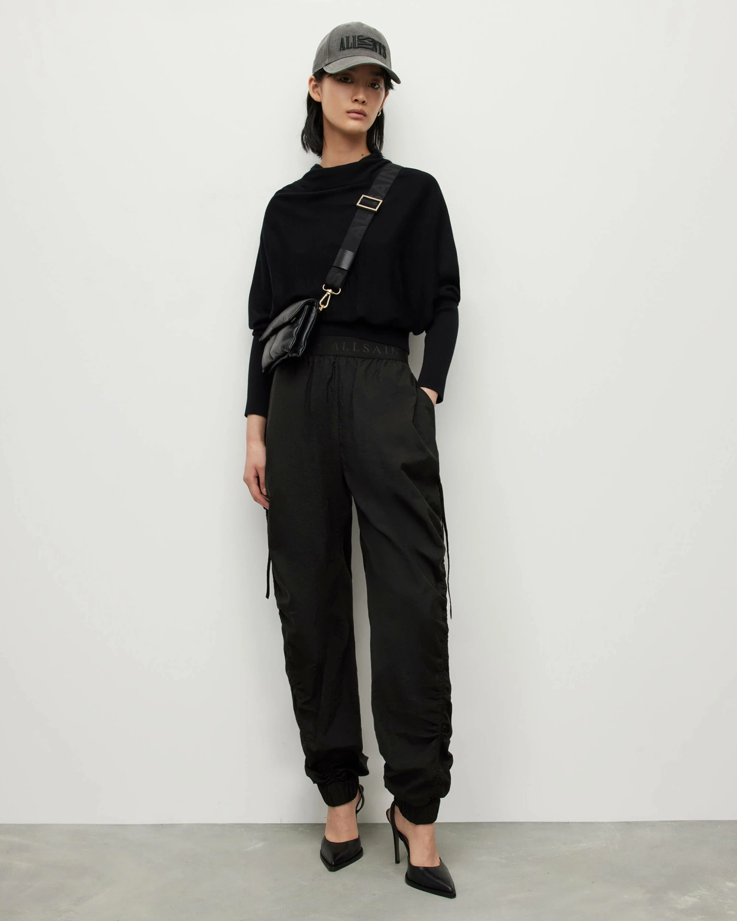 Meet the Aura Trousers – a modern wardrobe addition. The recycled nylon material is gathered at the sides with an adjustable drawcord. A unique shape, with our signature placed on the waistband.