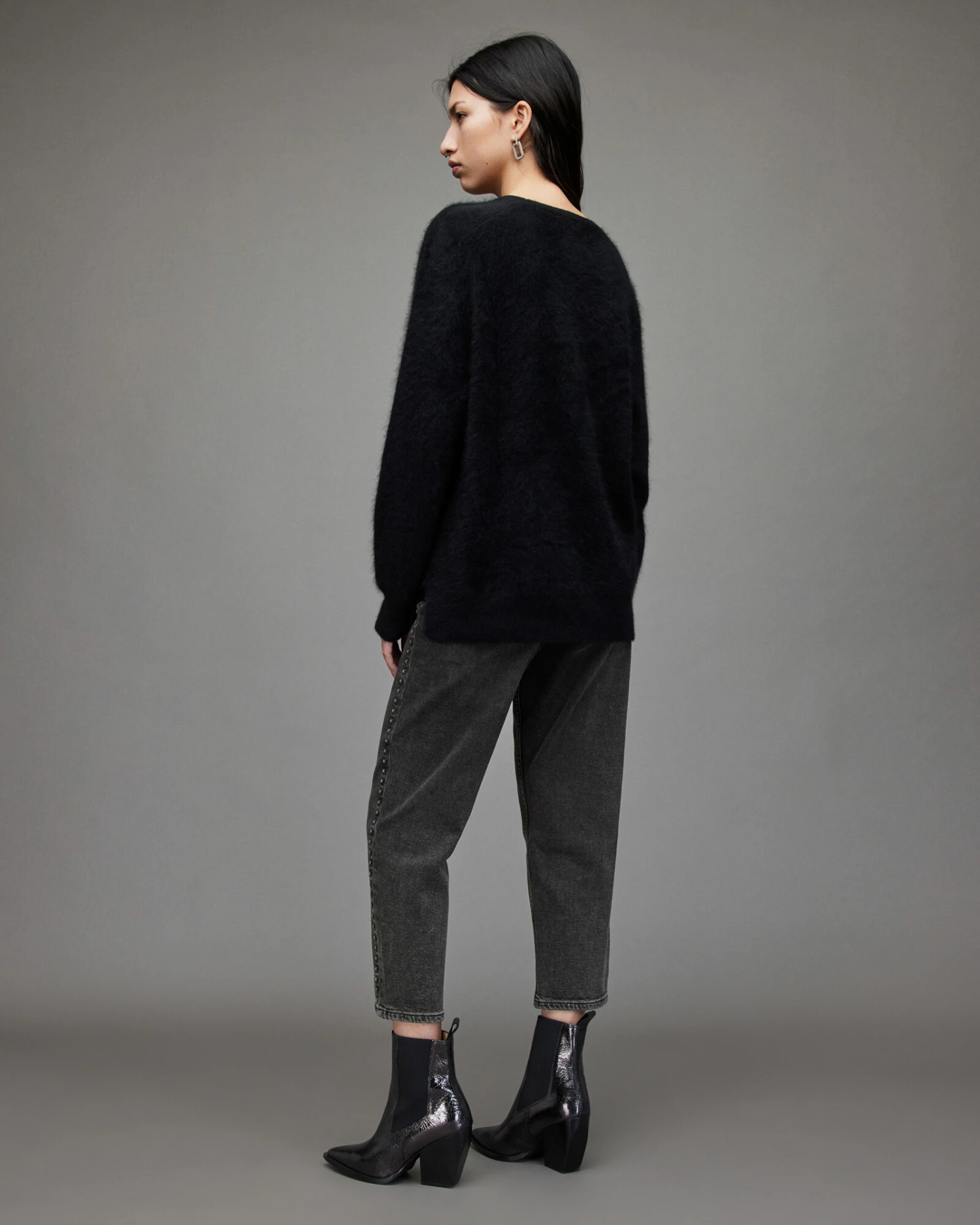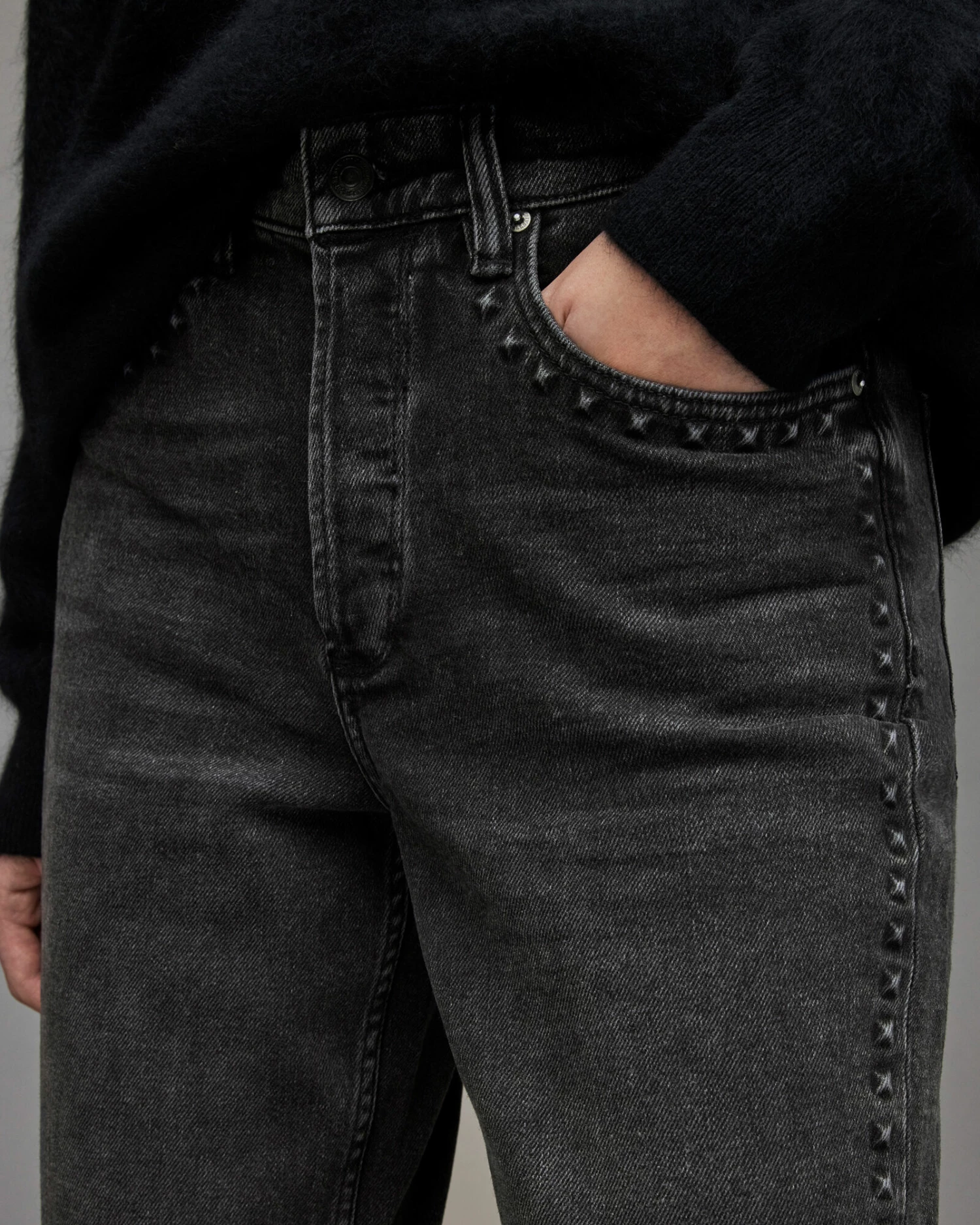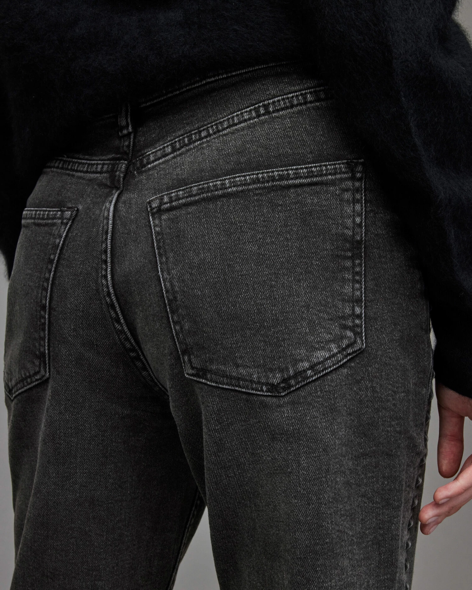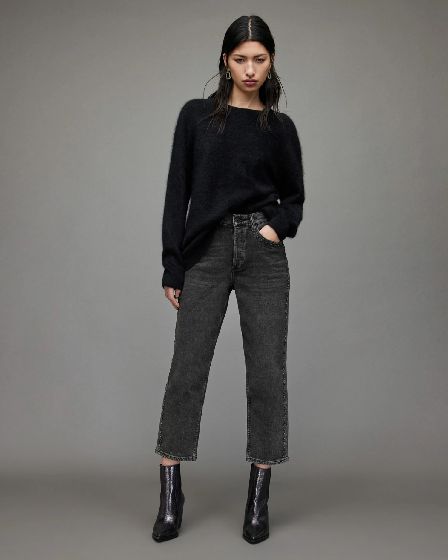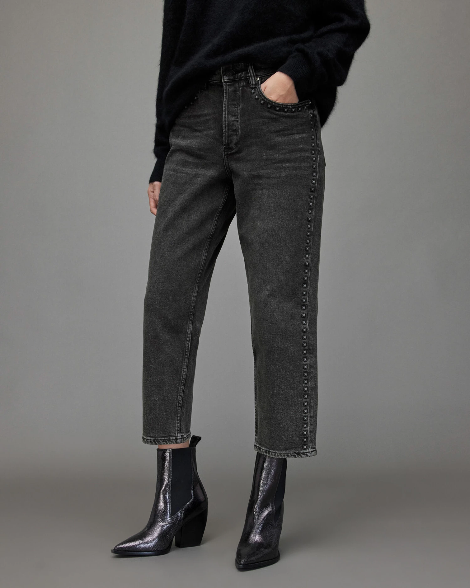 Studded moments. The Averi Jeans have been given a tough update. Shaped to a high waisted boyfriend silhouette with distressed hems. Tuck a t-shirt in and go.