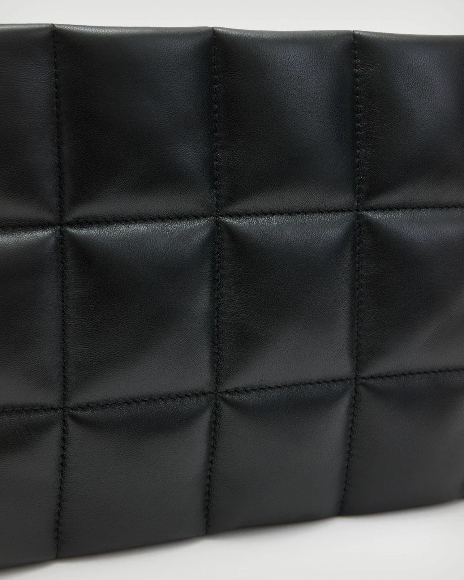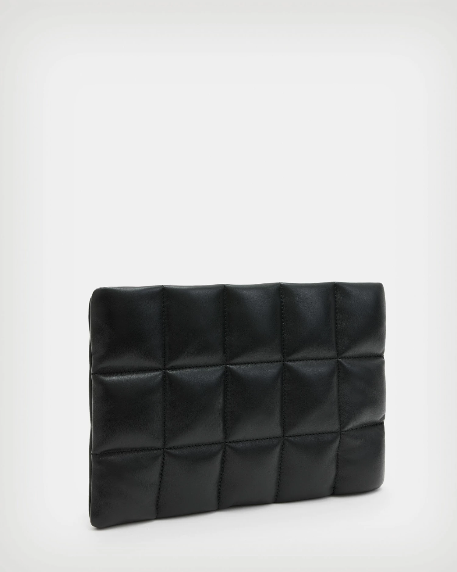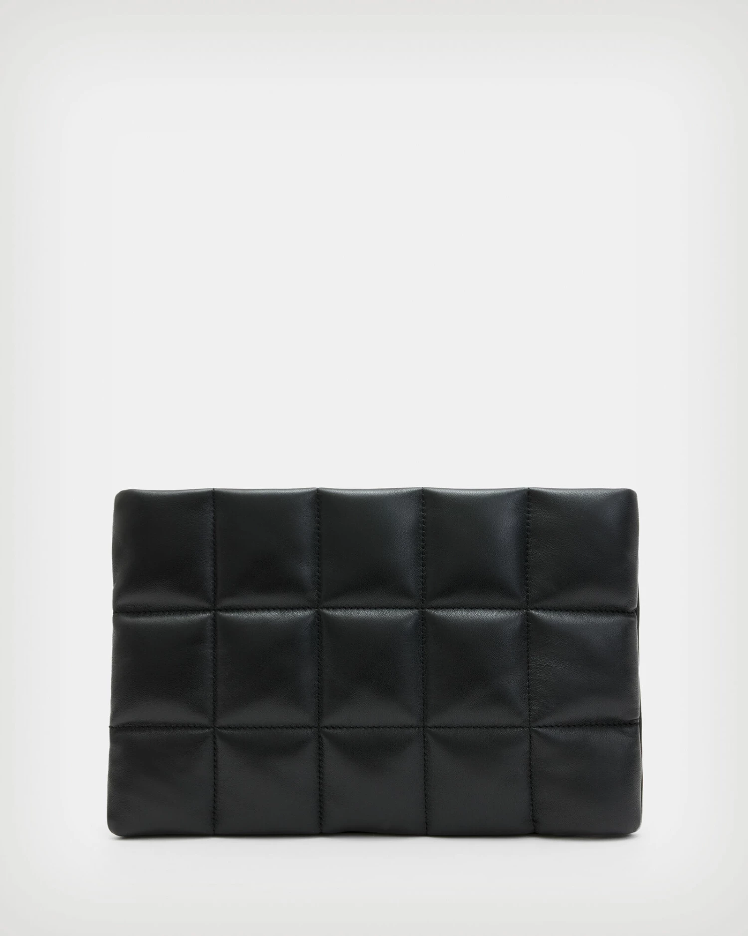 The Bettina Quilted Clutch Bag. Easy to grab on your way out. It’s crafted from leather. With a padded exterior. And cotton twill lining. The metal hardware is gold.