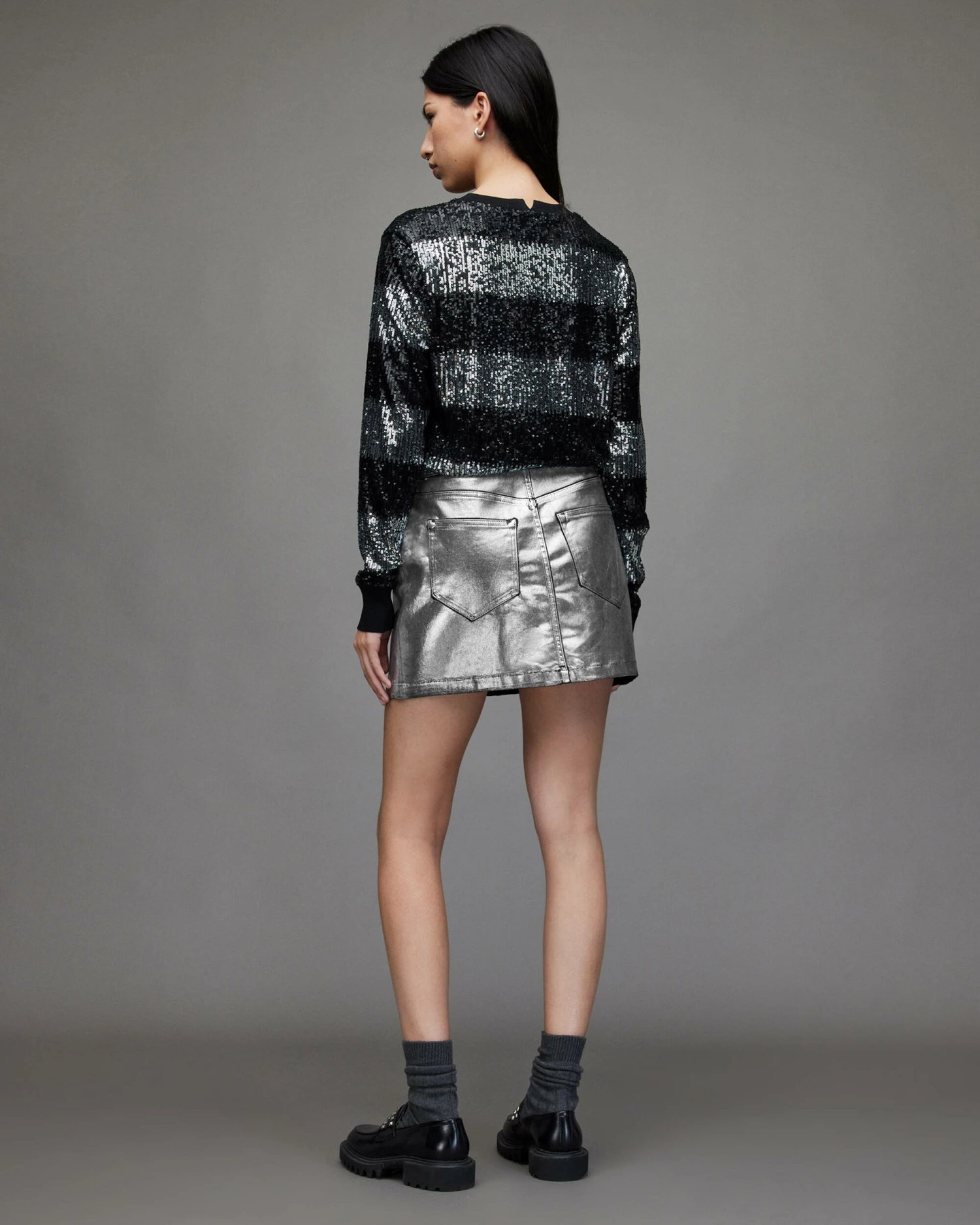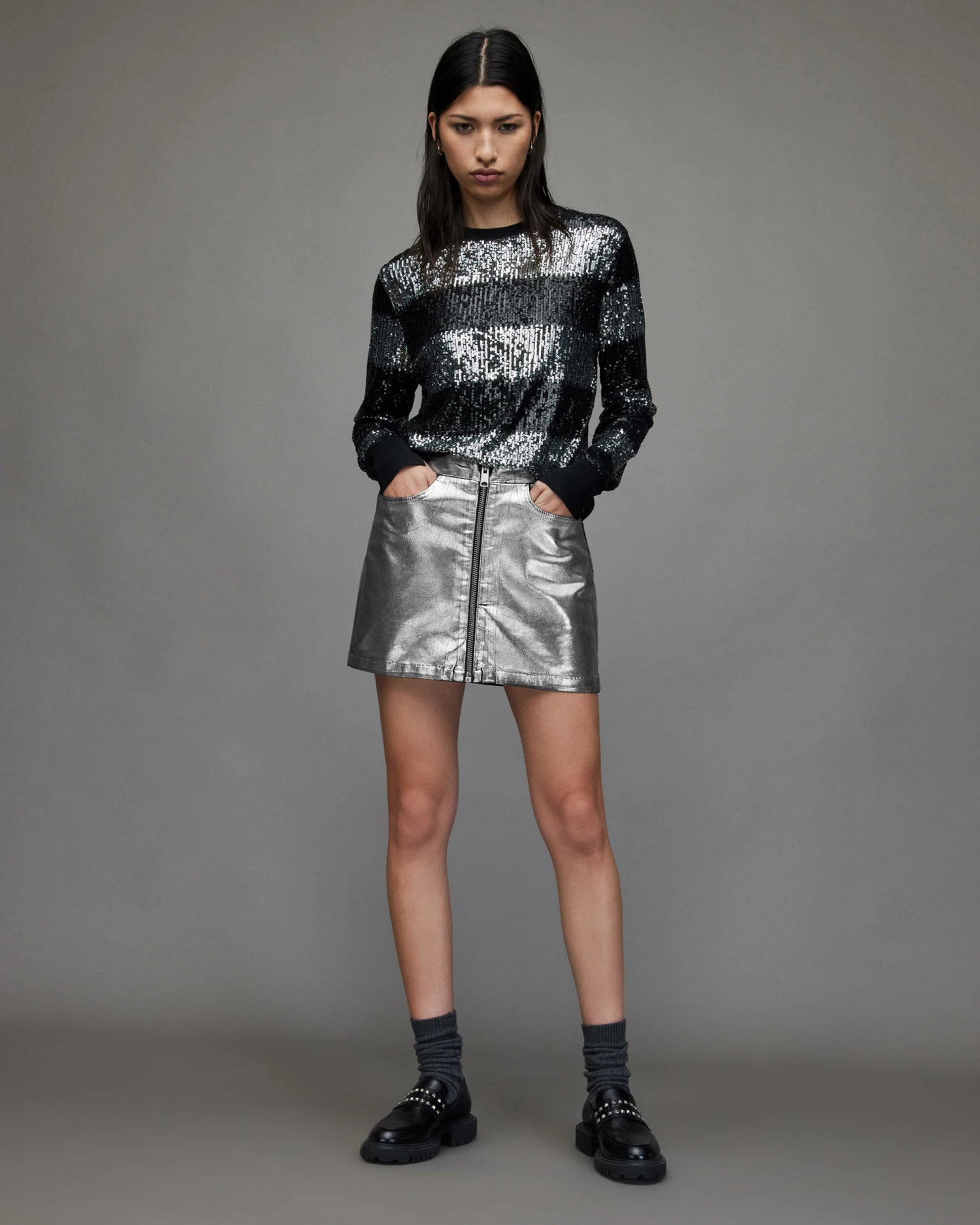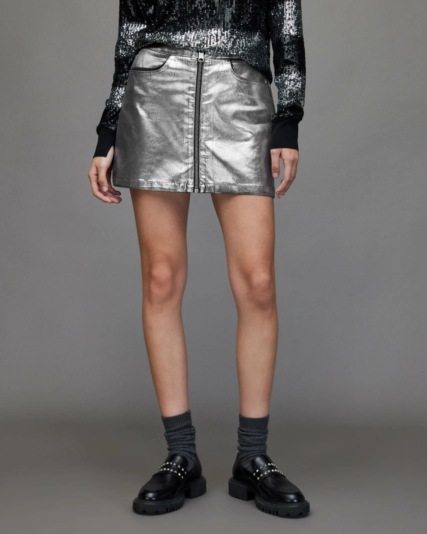 Do it in metallics. This zip through skirt is high waisted and mini. Tuck in a tee and take it from day-to-night. It’s called the Cleo.