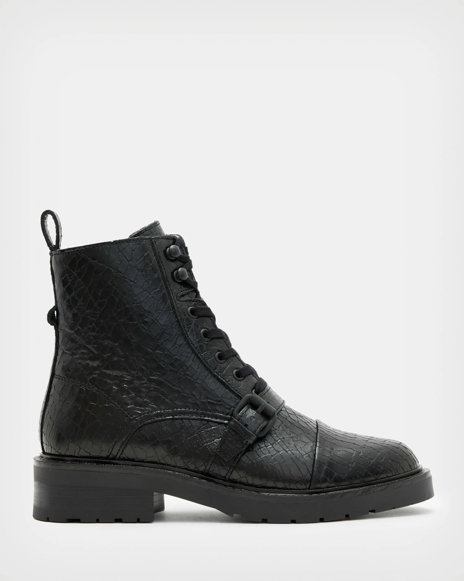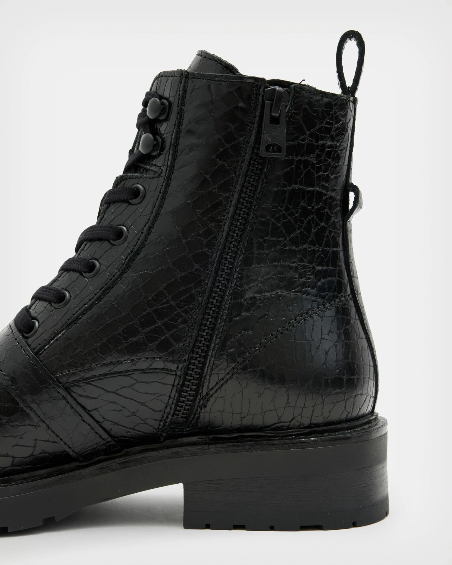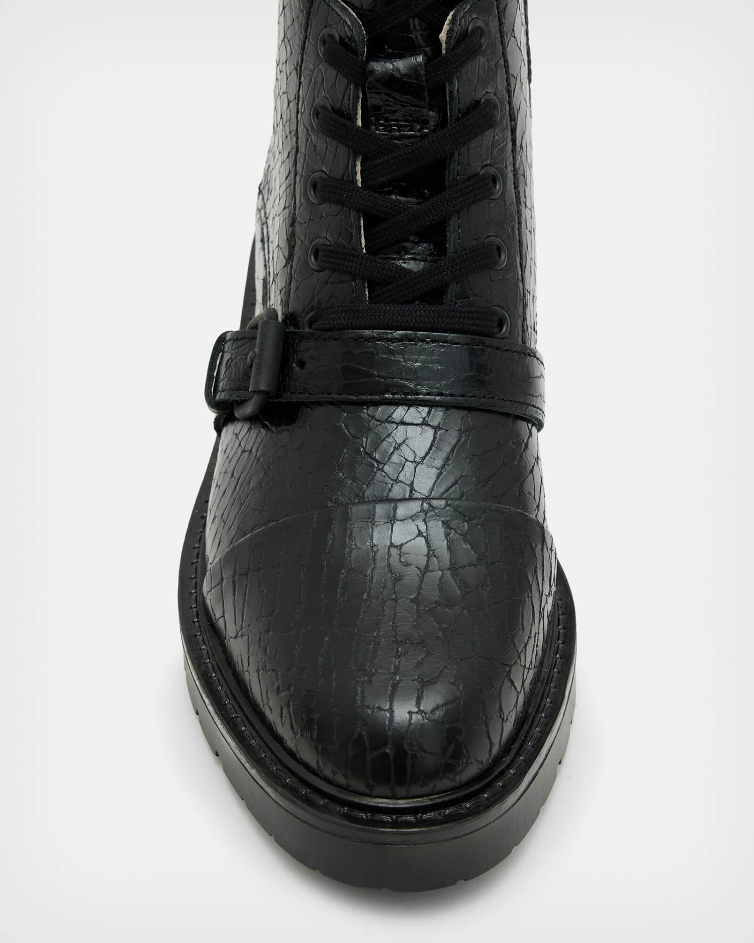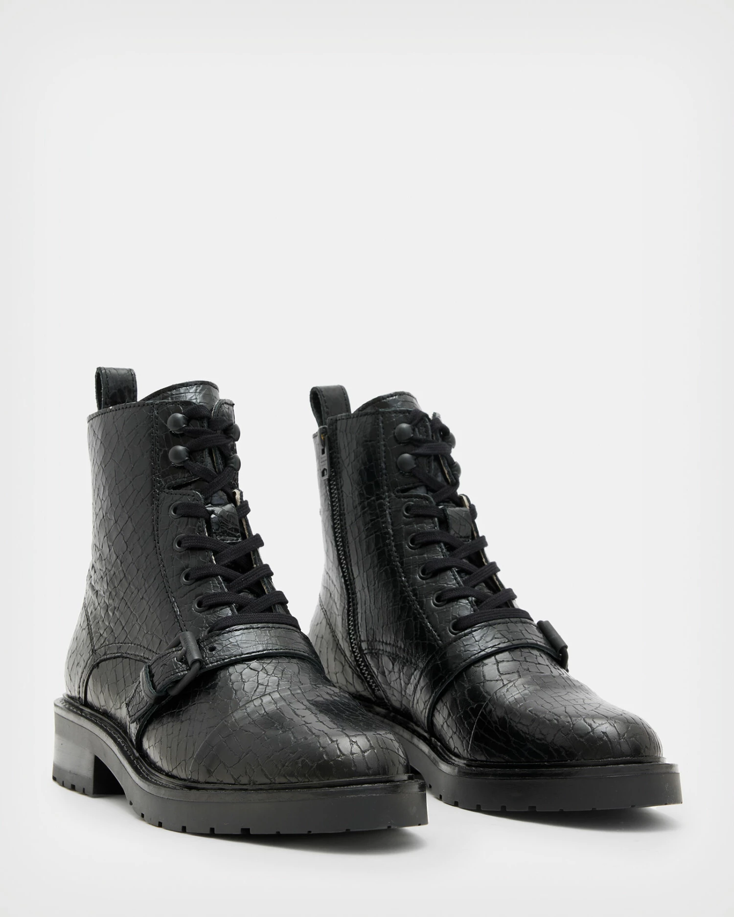 Cargo boots are essential. The Donitas. Crafted from crocodile printed leather. With military-inspired buckles. And wrap-around laces.