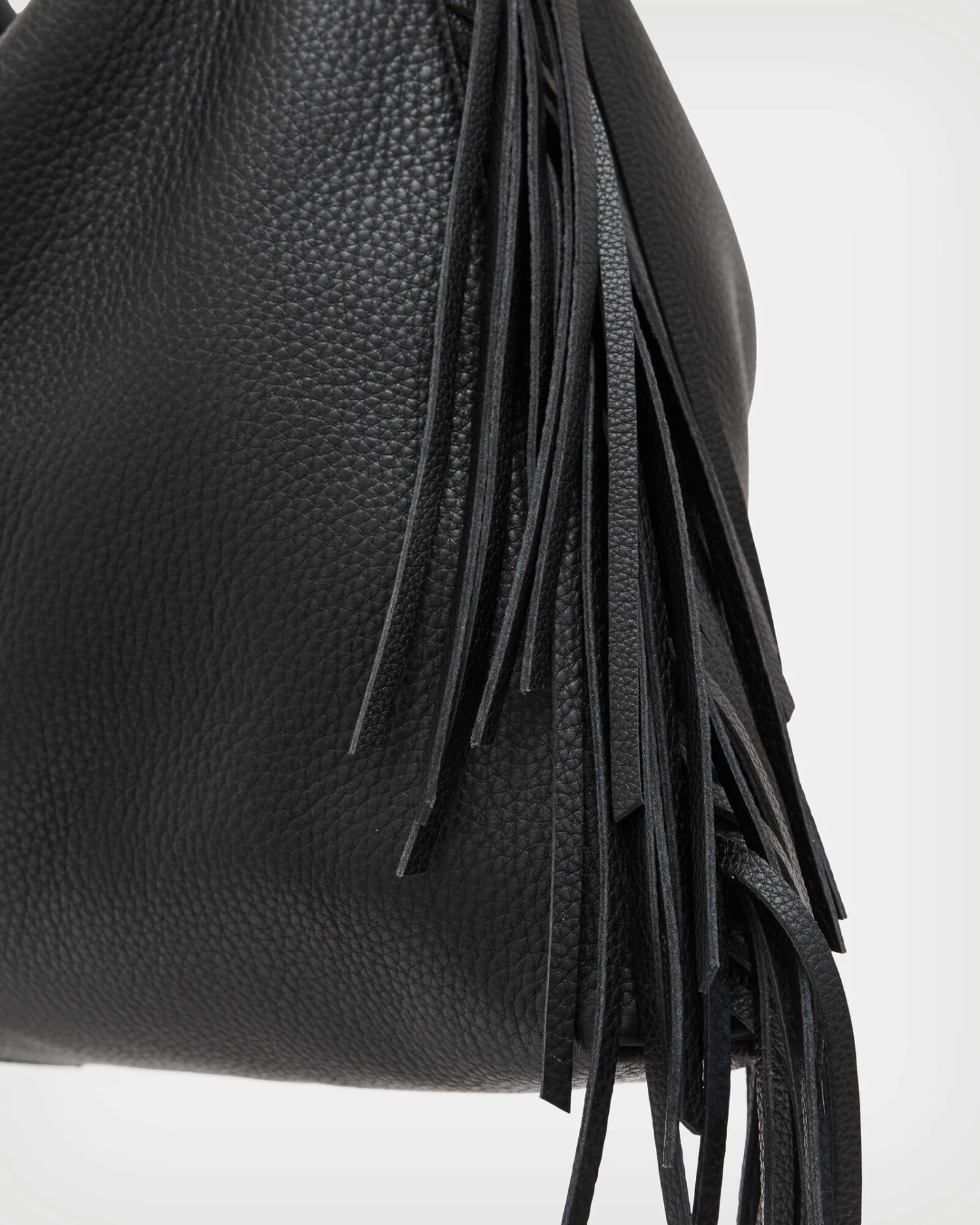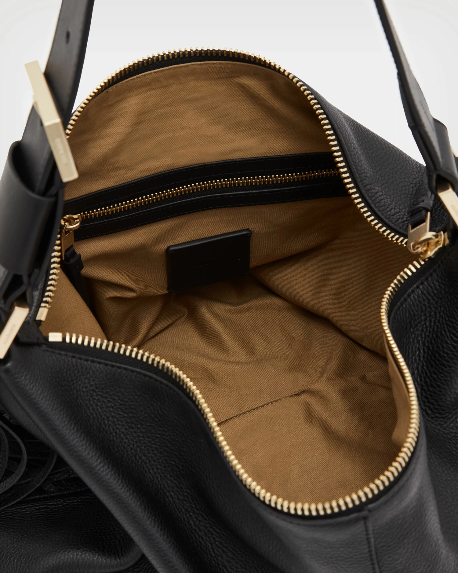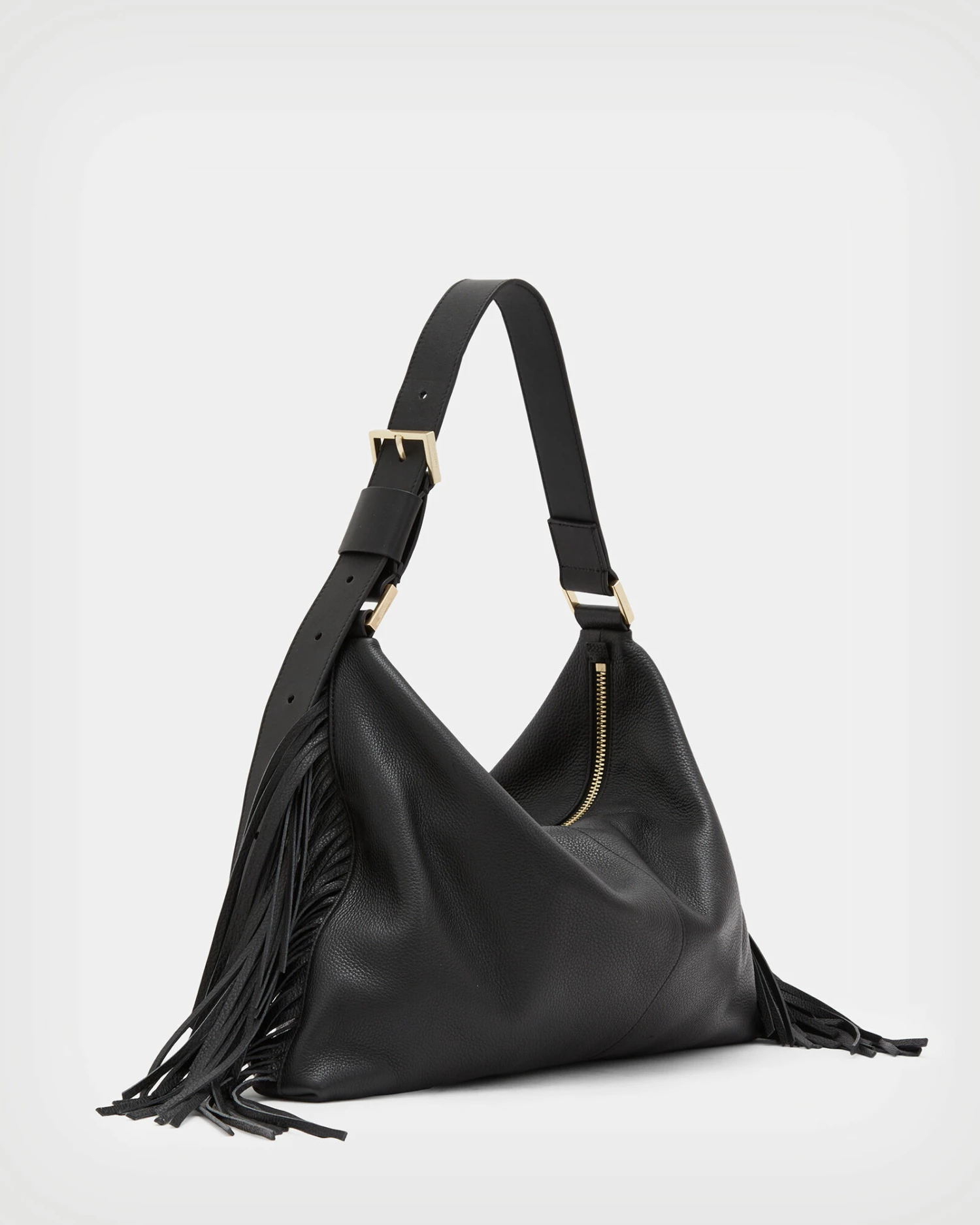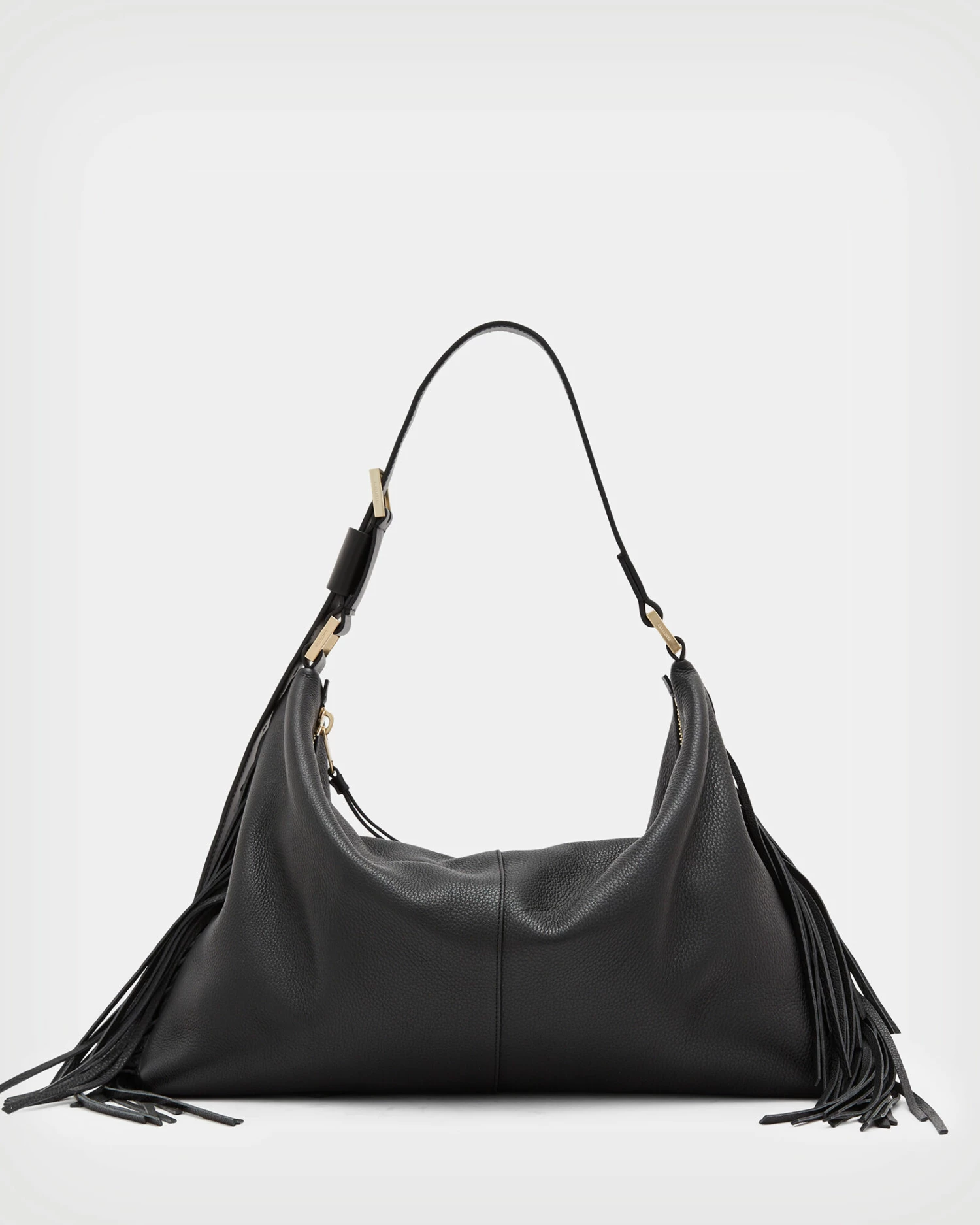 Slouchy and easy. The Edbury Fringe Shoulder Bag. This one has tassel edges. Crafted from super-soft leather, with gold-tone hardware and an adjustable shoulder strap.