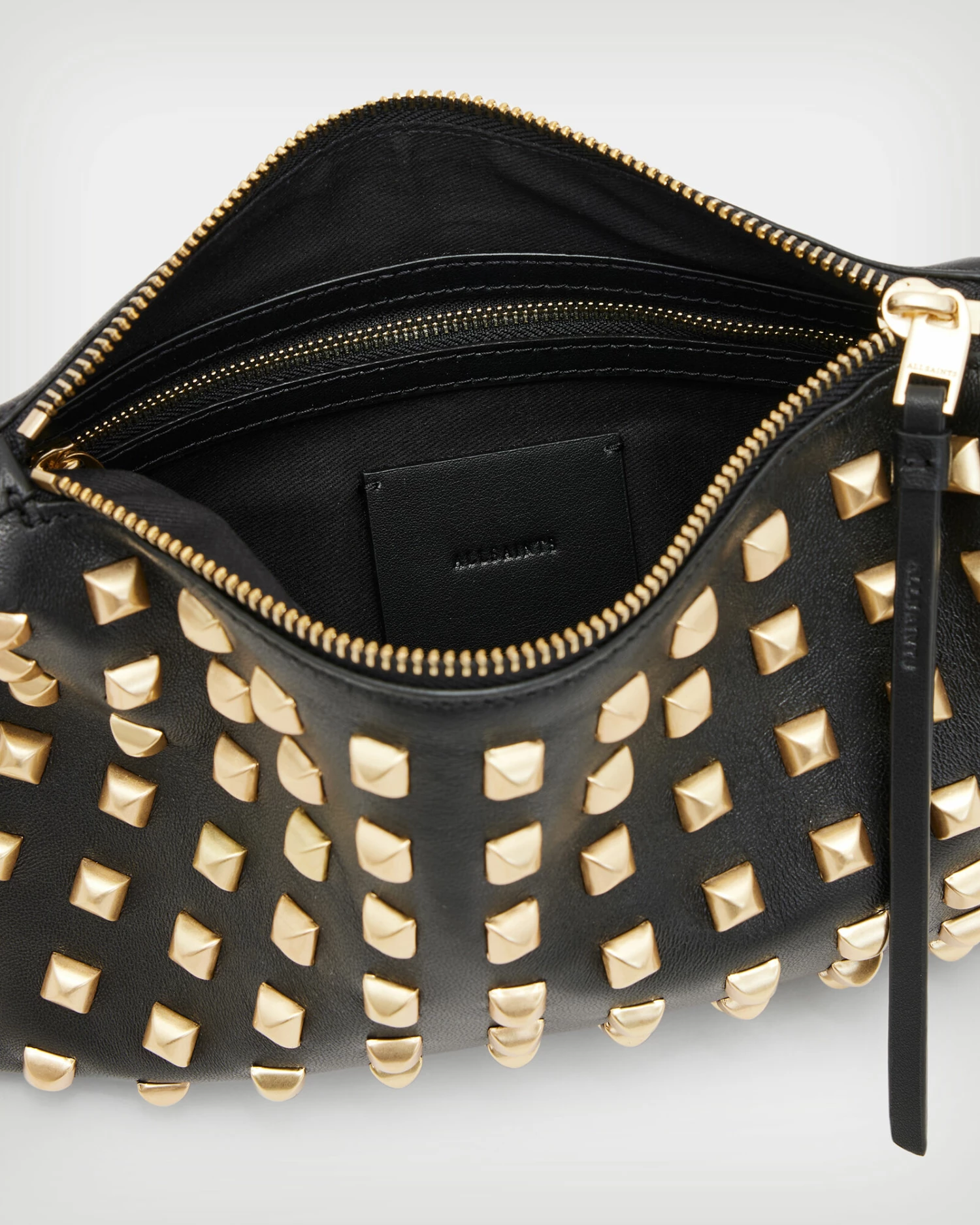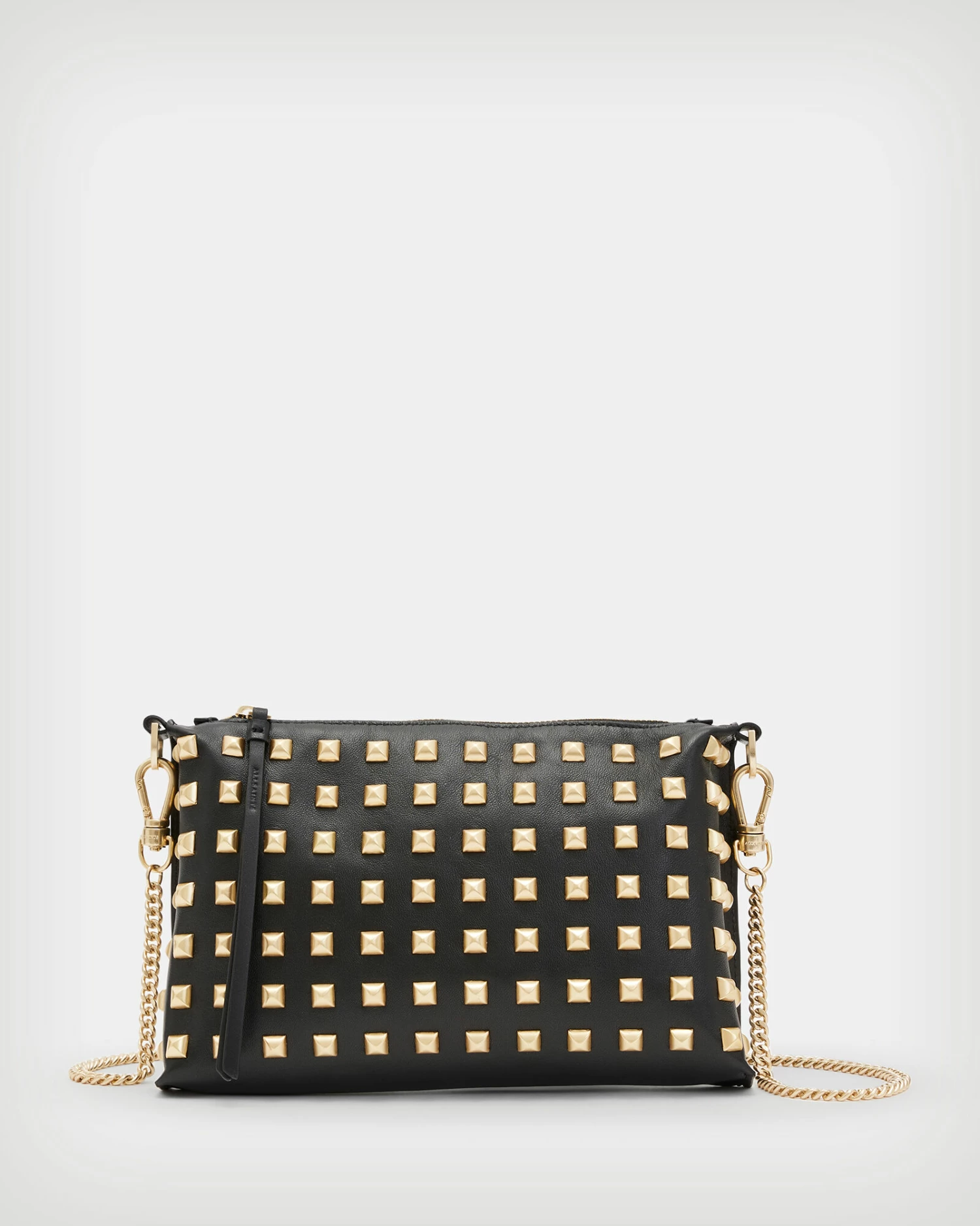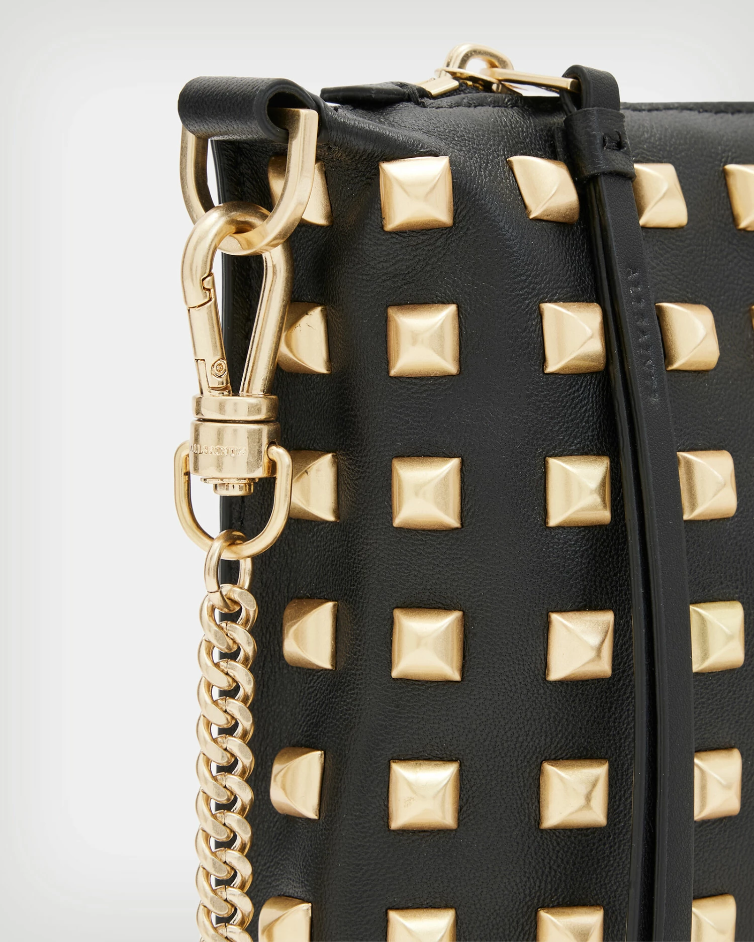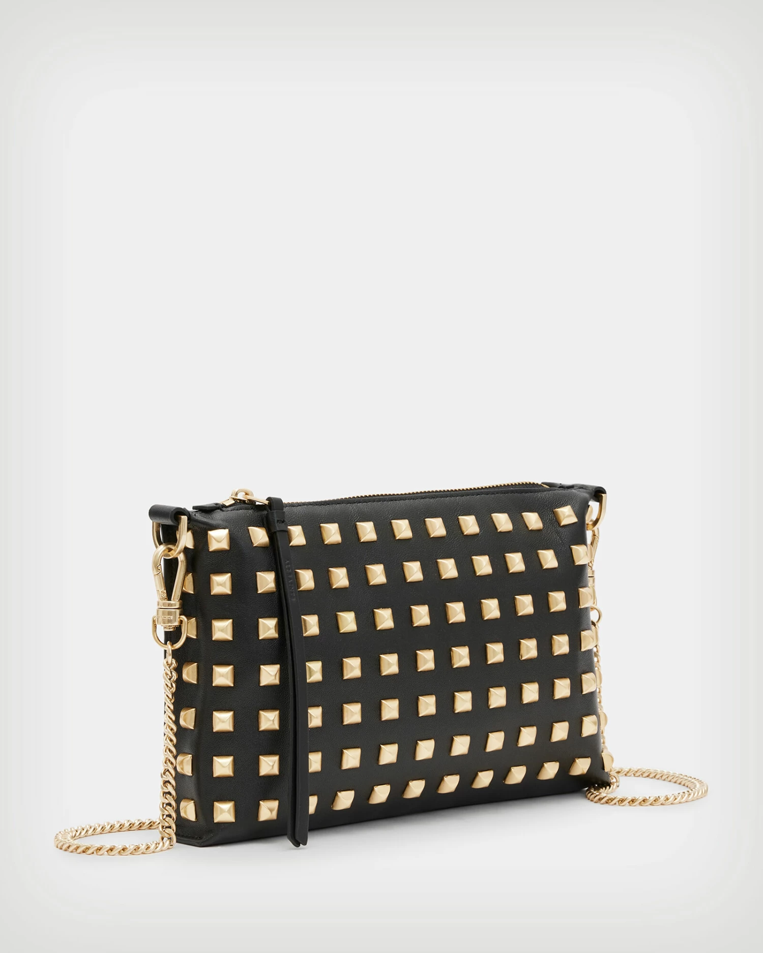 This bag’s a favourite. Crafted from leather, it’s studded. Finished with metal hardware and chain strap – it’s called the Eve.