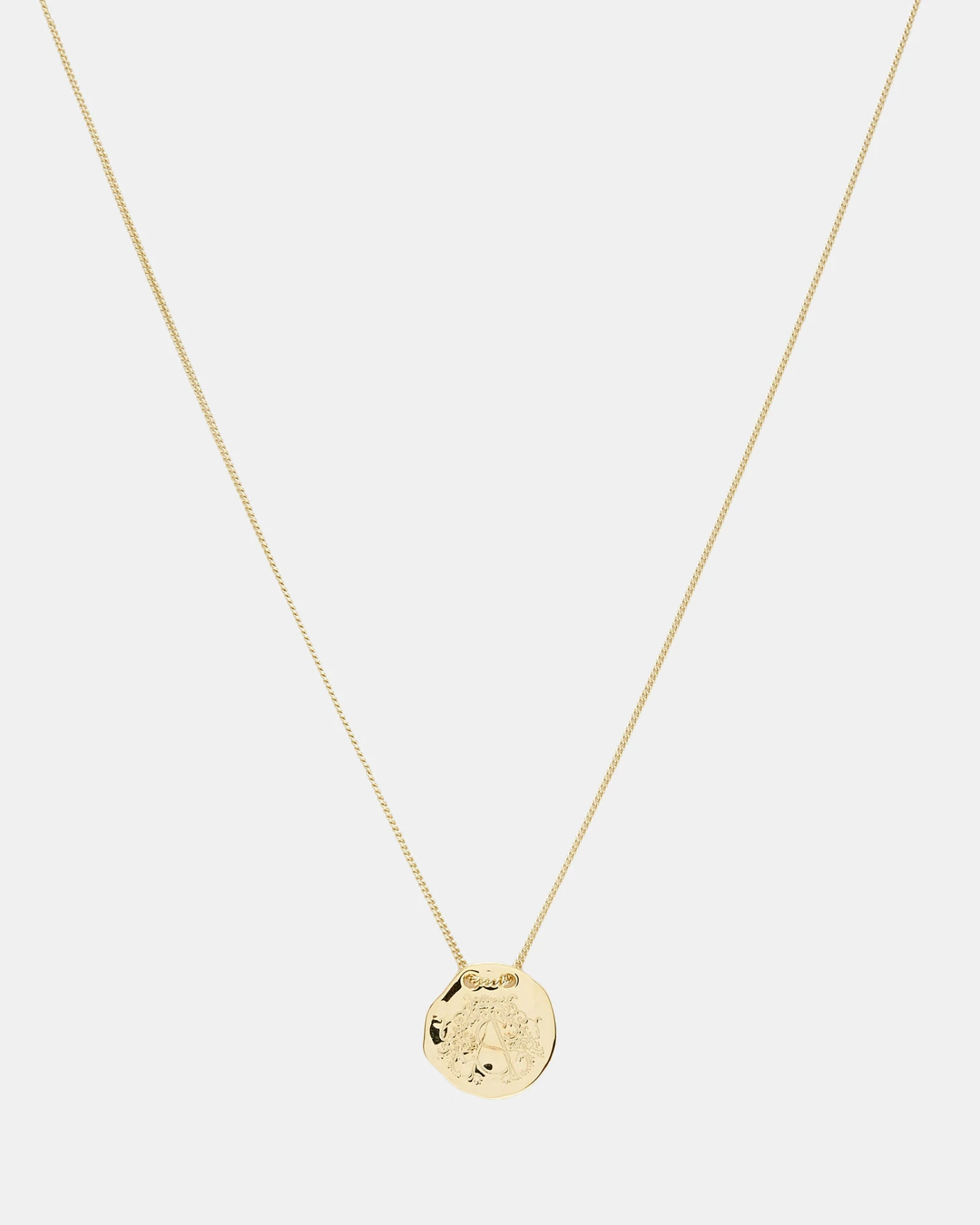 Made from sterling silver and finished with gold vermeil coating, this is the Helini Necklace. It features a long chain with a coin pendant – look closely at the engraved artwork.