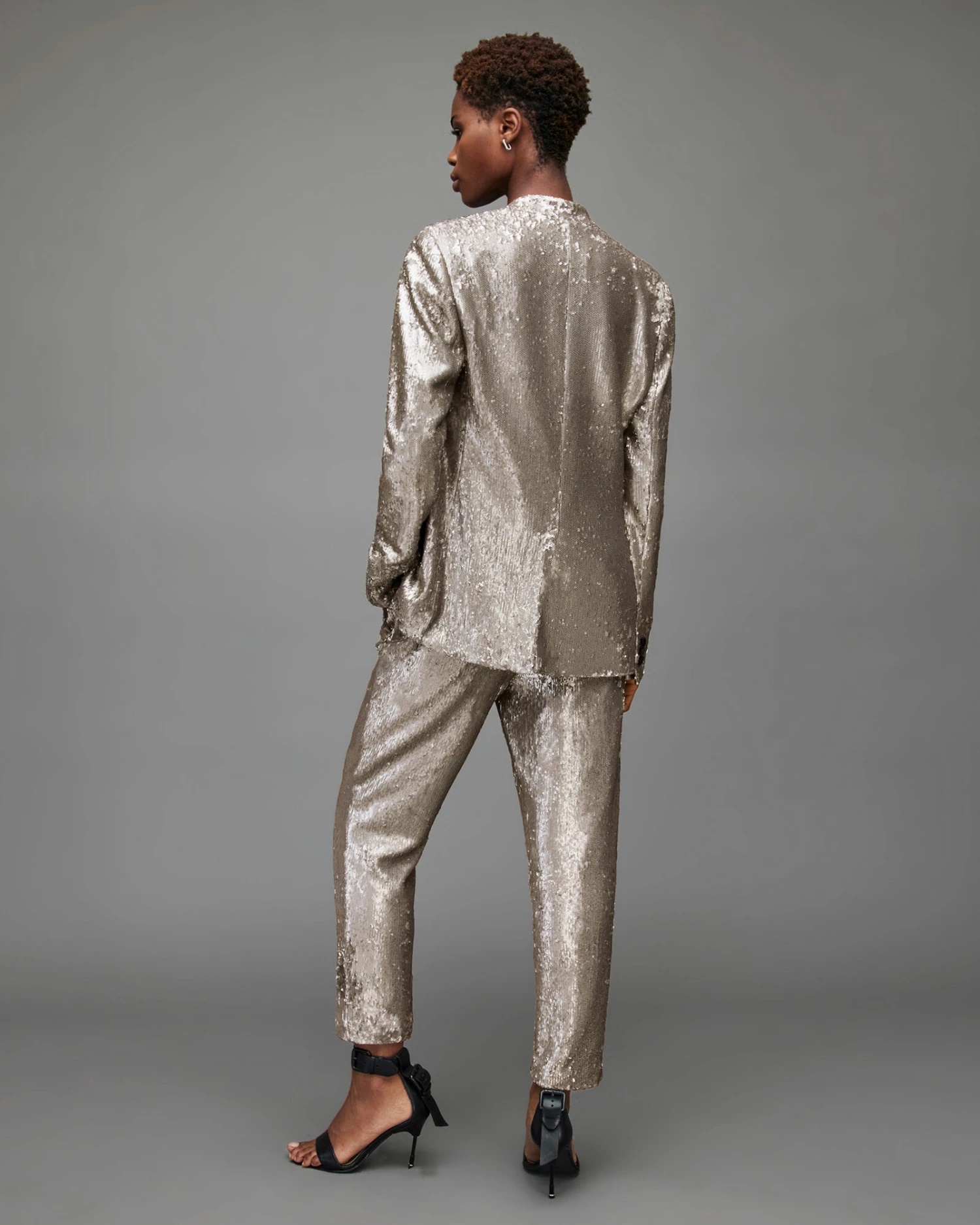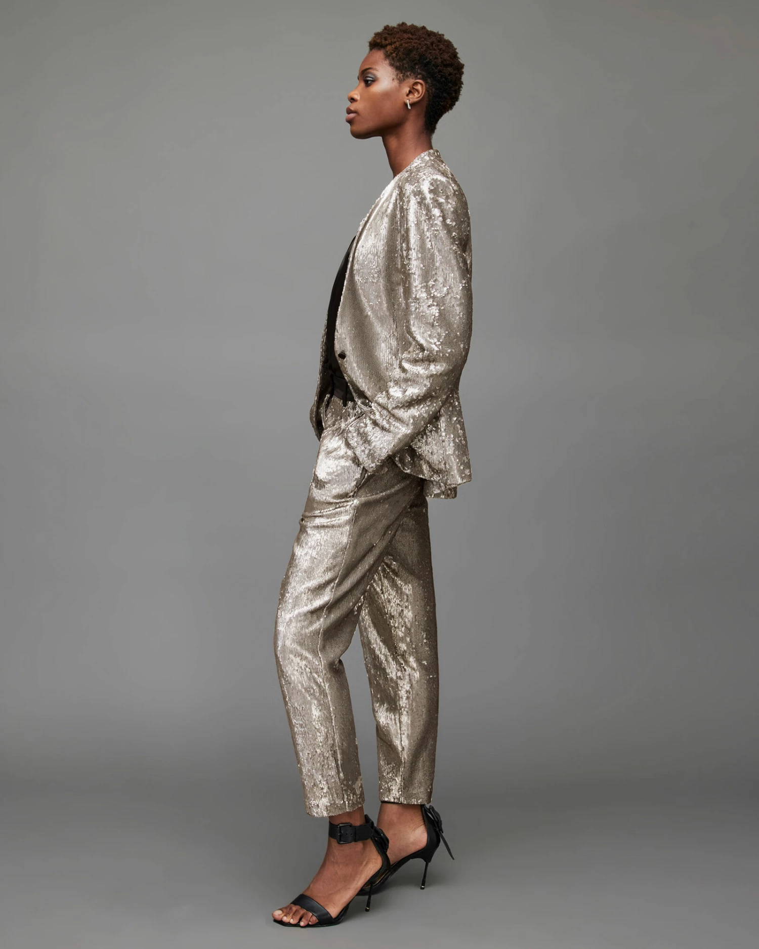 Make an impact. The Leigh Trousers are covered in sequins. The clean construction features a contrasting satin waistband. This is tailoring, the AllSaints way.