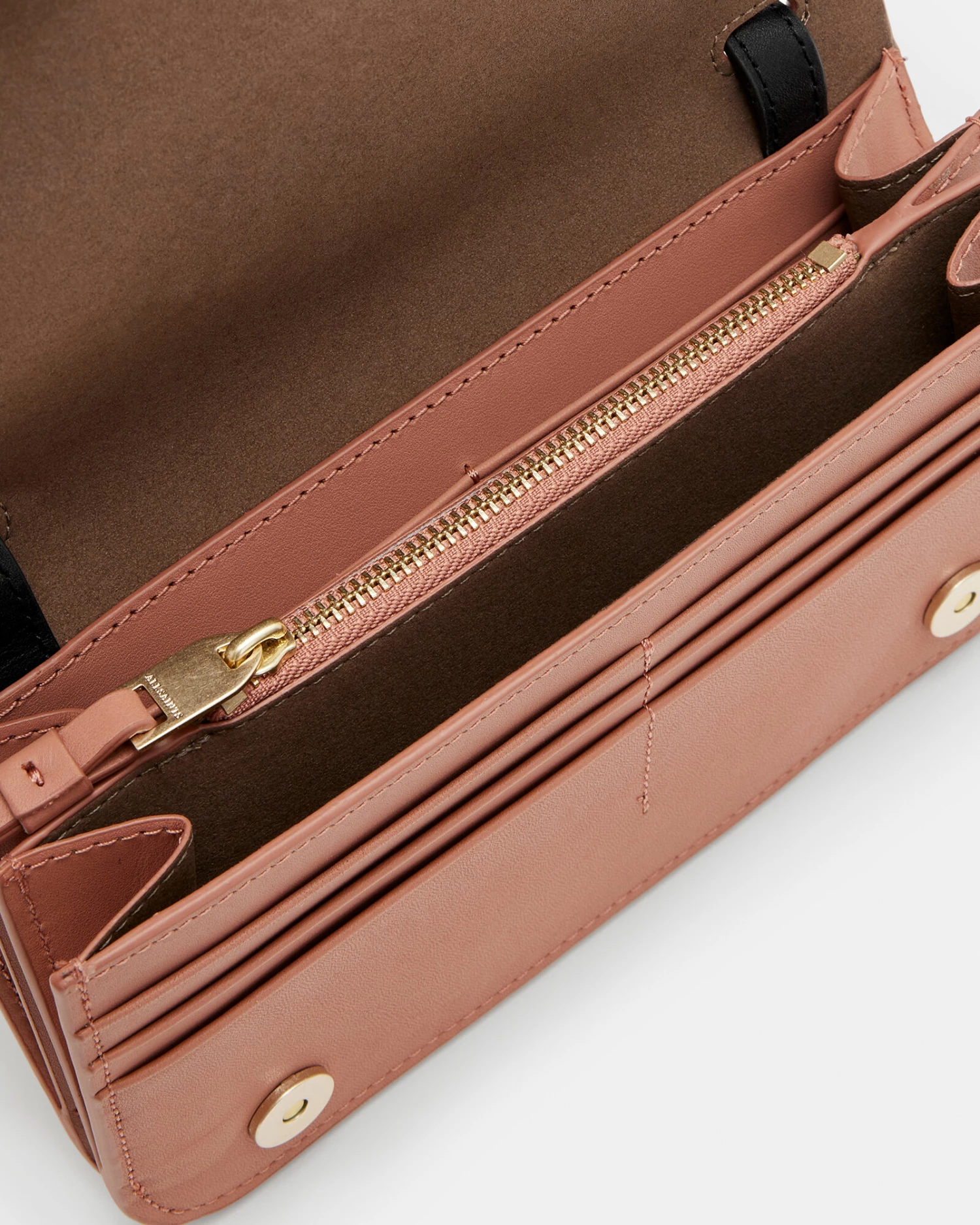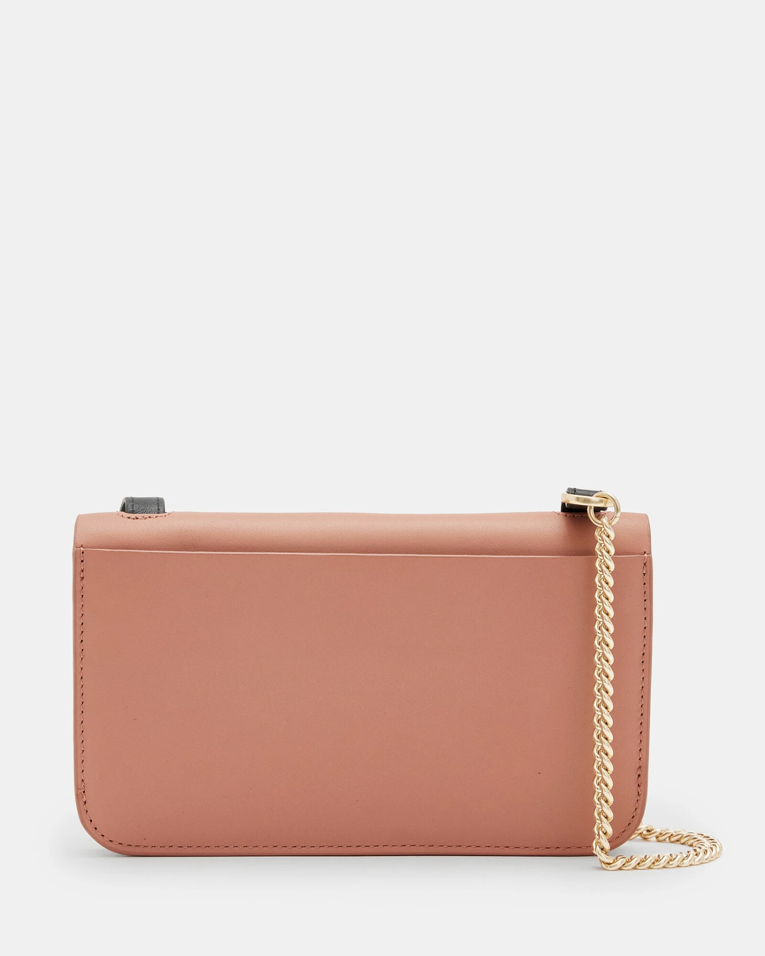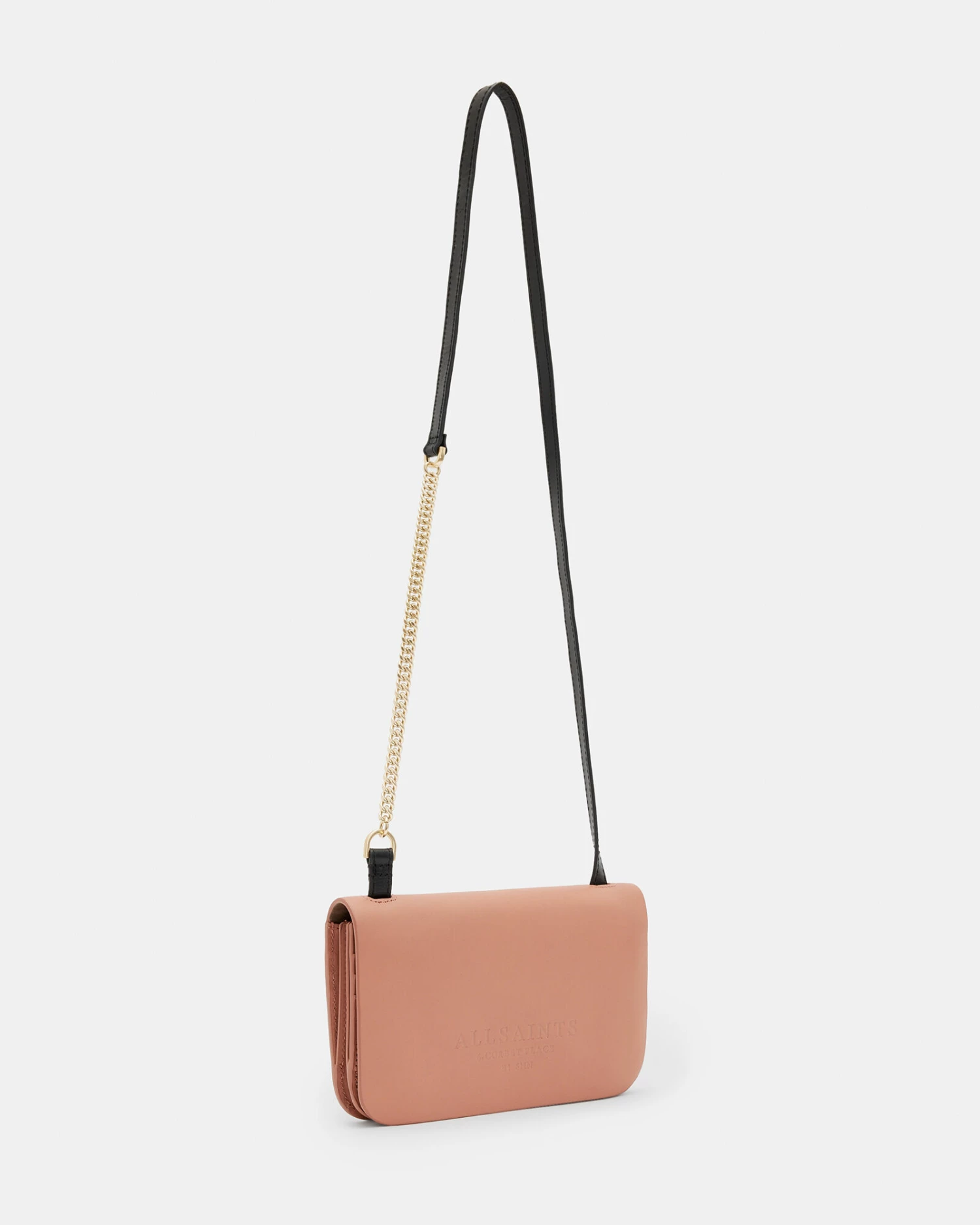 For the essentials, this is The Ludivine Crossbody Wallet. Crafted from smooth leather, it has multiple compartments. The half chain, half leather strap keeps everything close.
