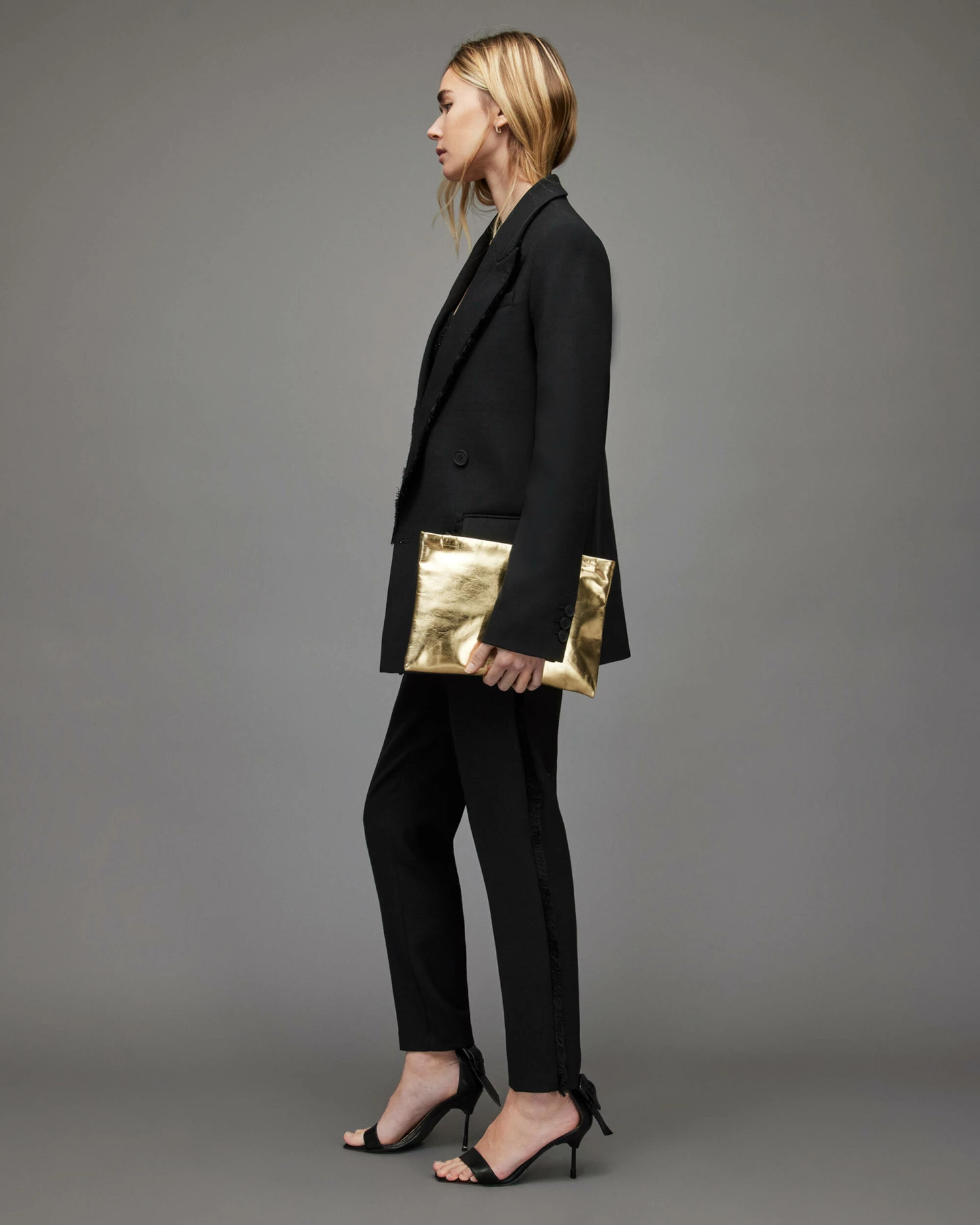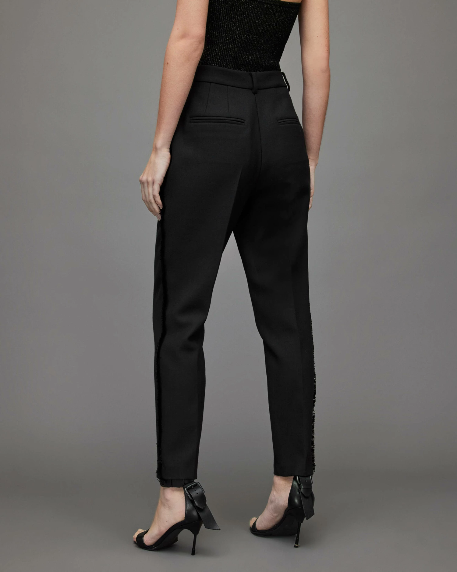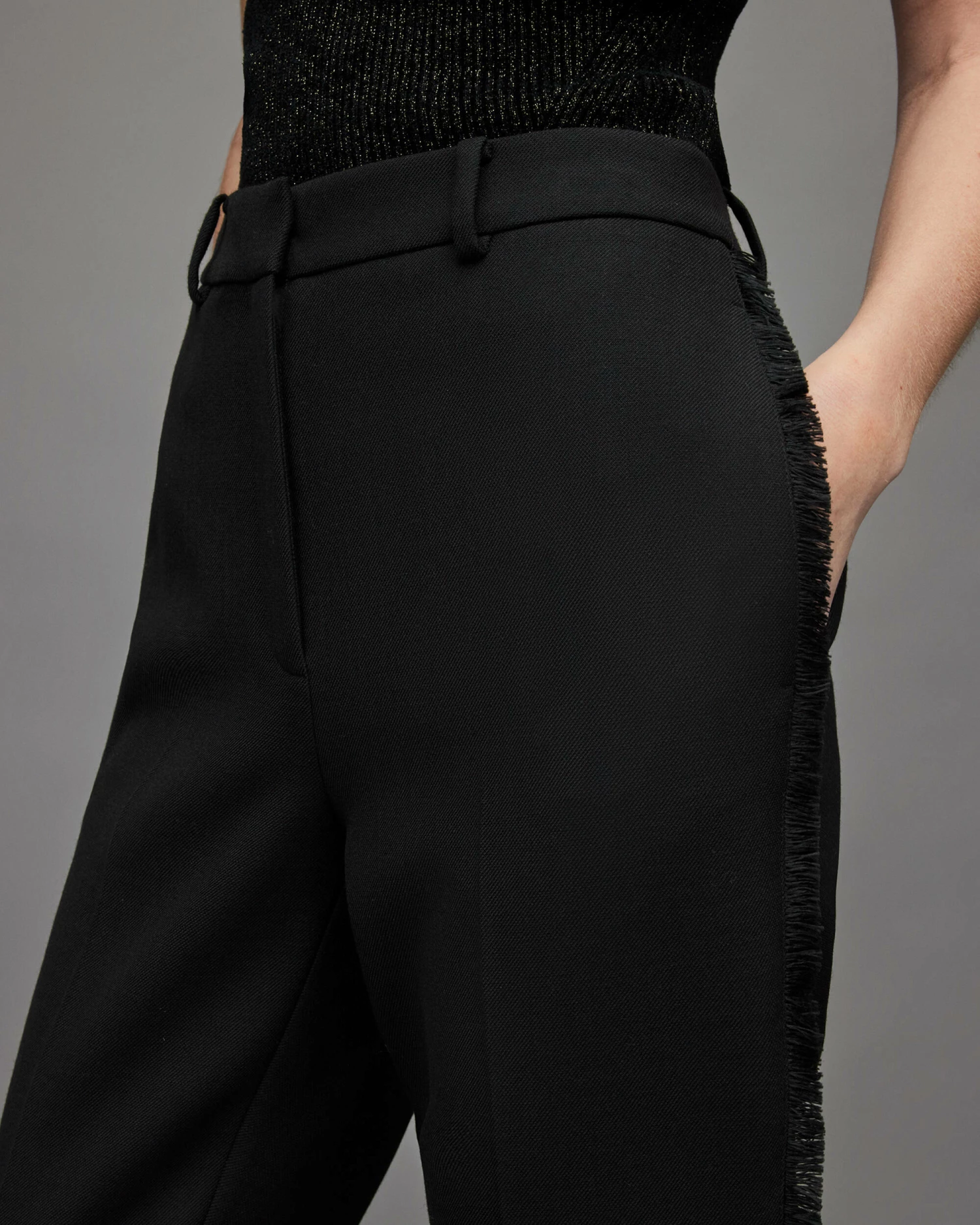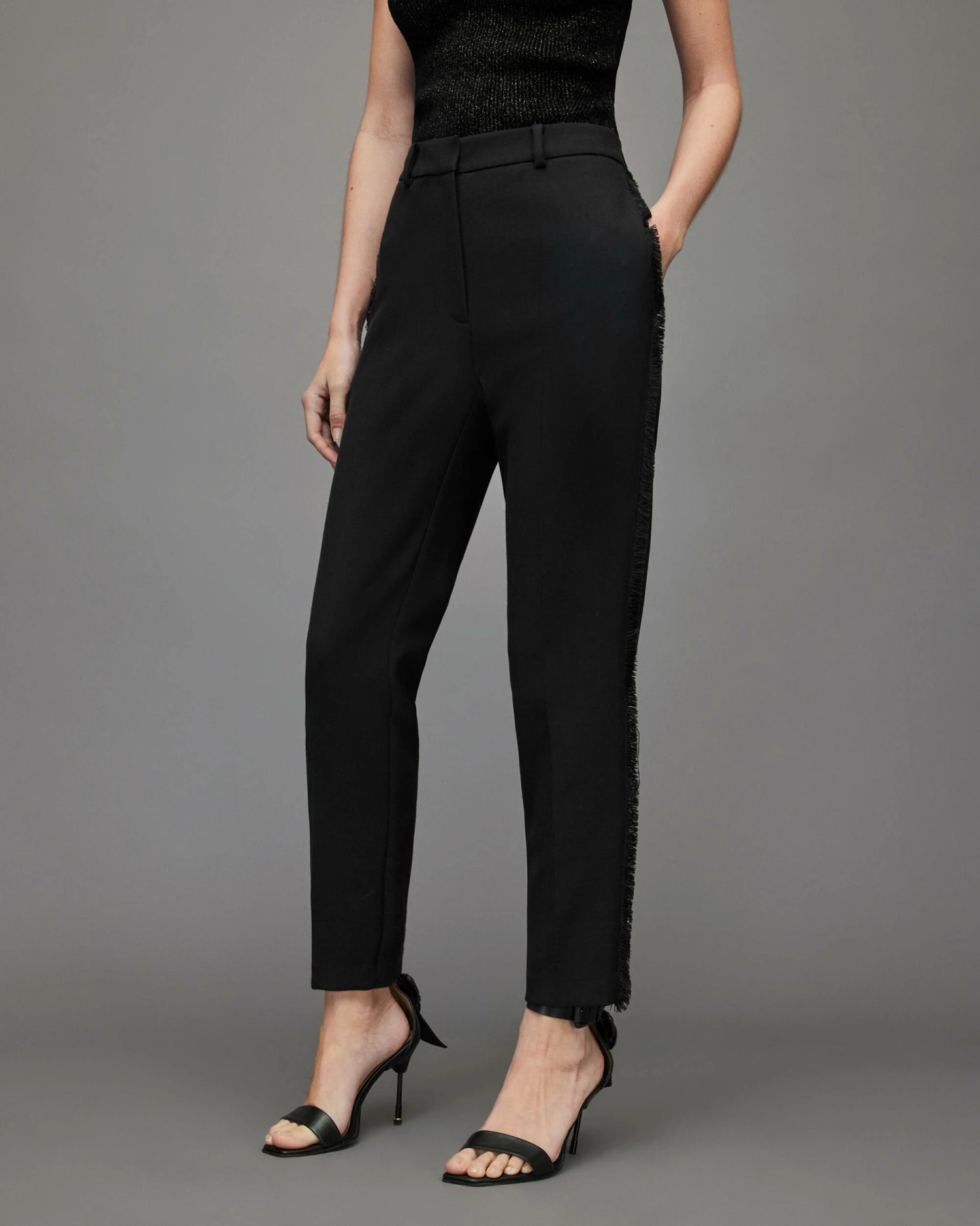 Toned down tailoring. These are the Maxine Trousers. Mid-rise and slim fitting, there’s a subtle fringed trim down the sides. Smart styling just got an update.