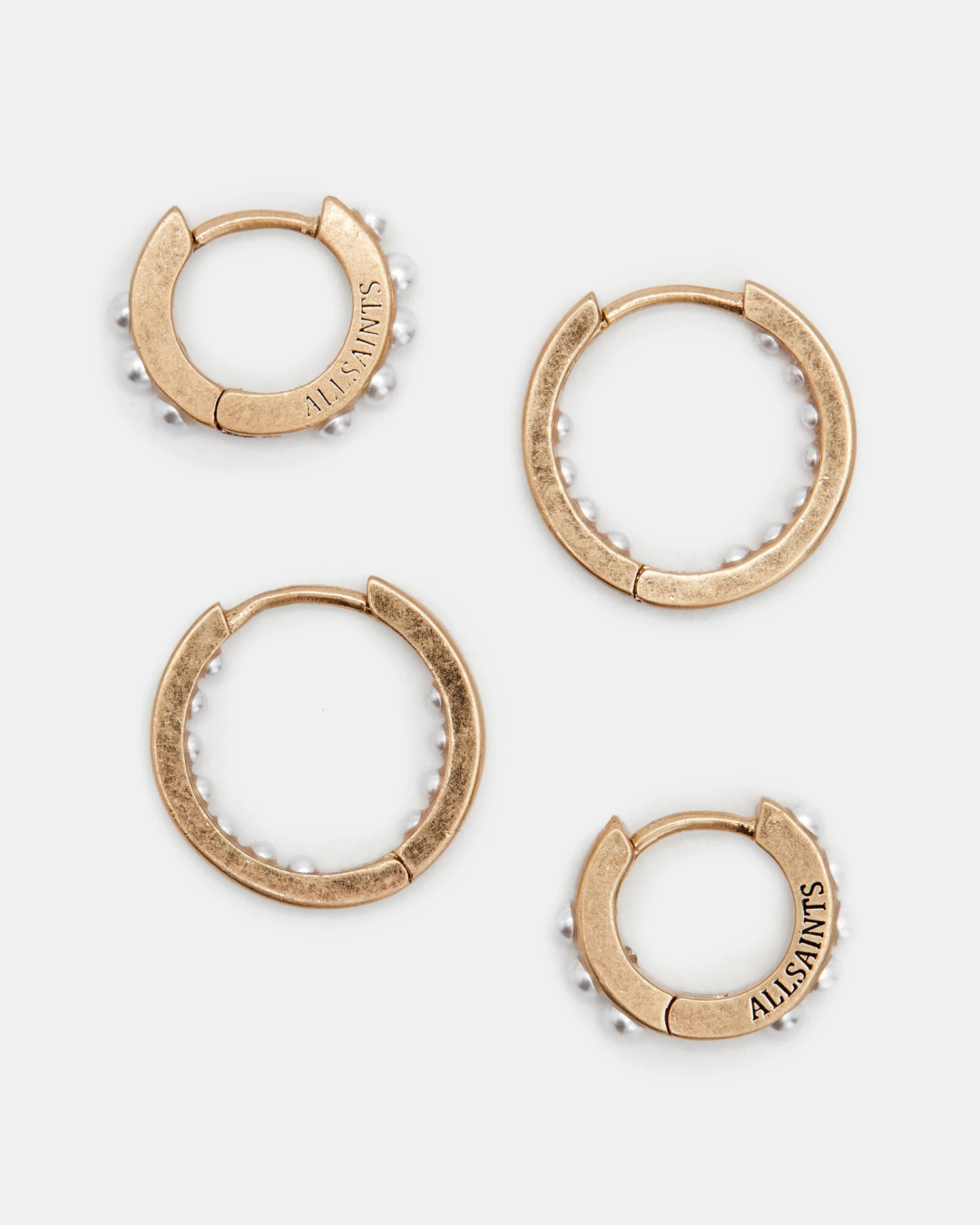 Pearl beads on gold tone hoops – these earrings are a must. A set of two to mix and match makes them ideal for everyday wear. Find our signature engraved.