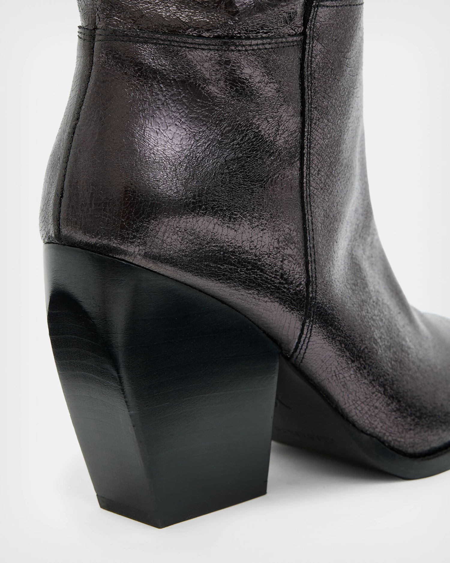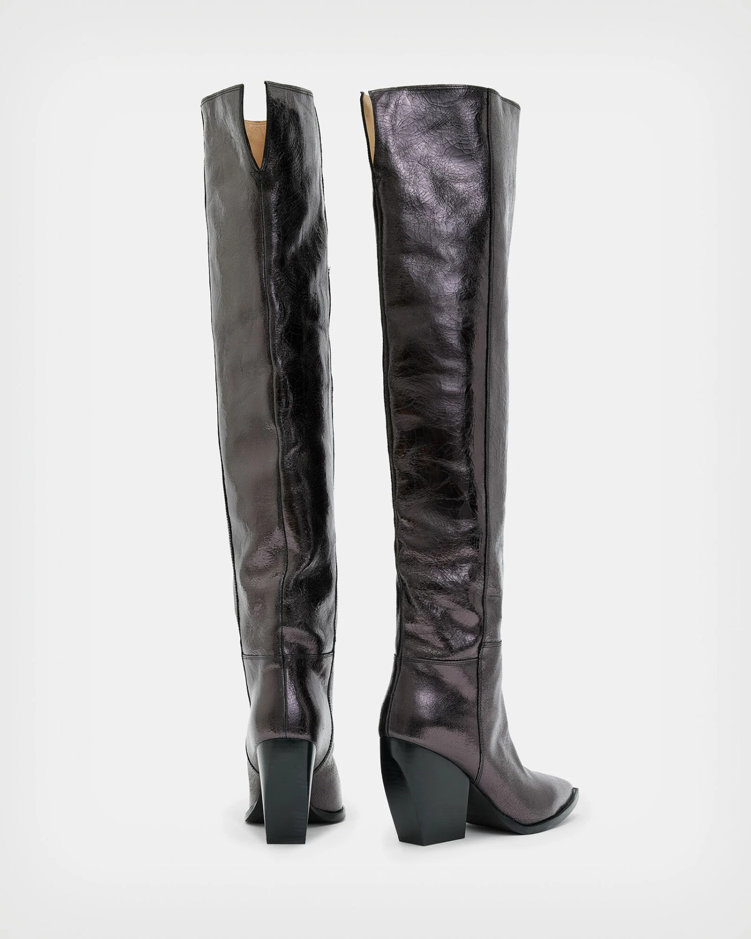 Take it over the knee. Meet the Reina Boots. Crafted from metallic textured leather, they’ve got a sophisticated shape with a classic feel. Dress them up or down – they’re versatile