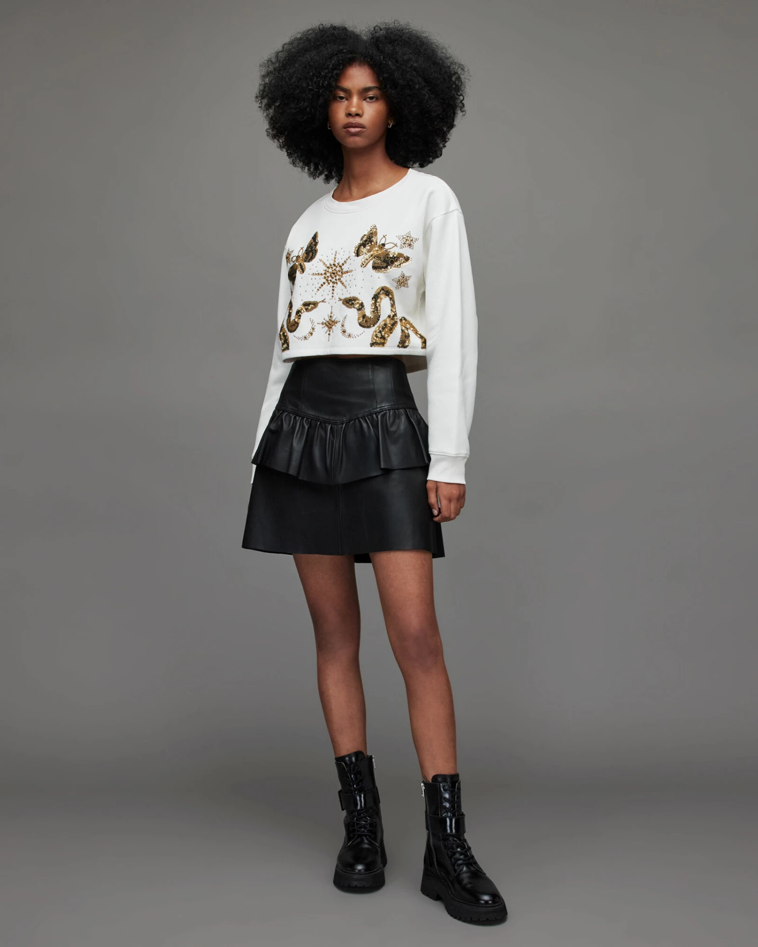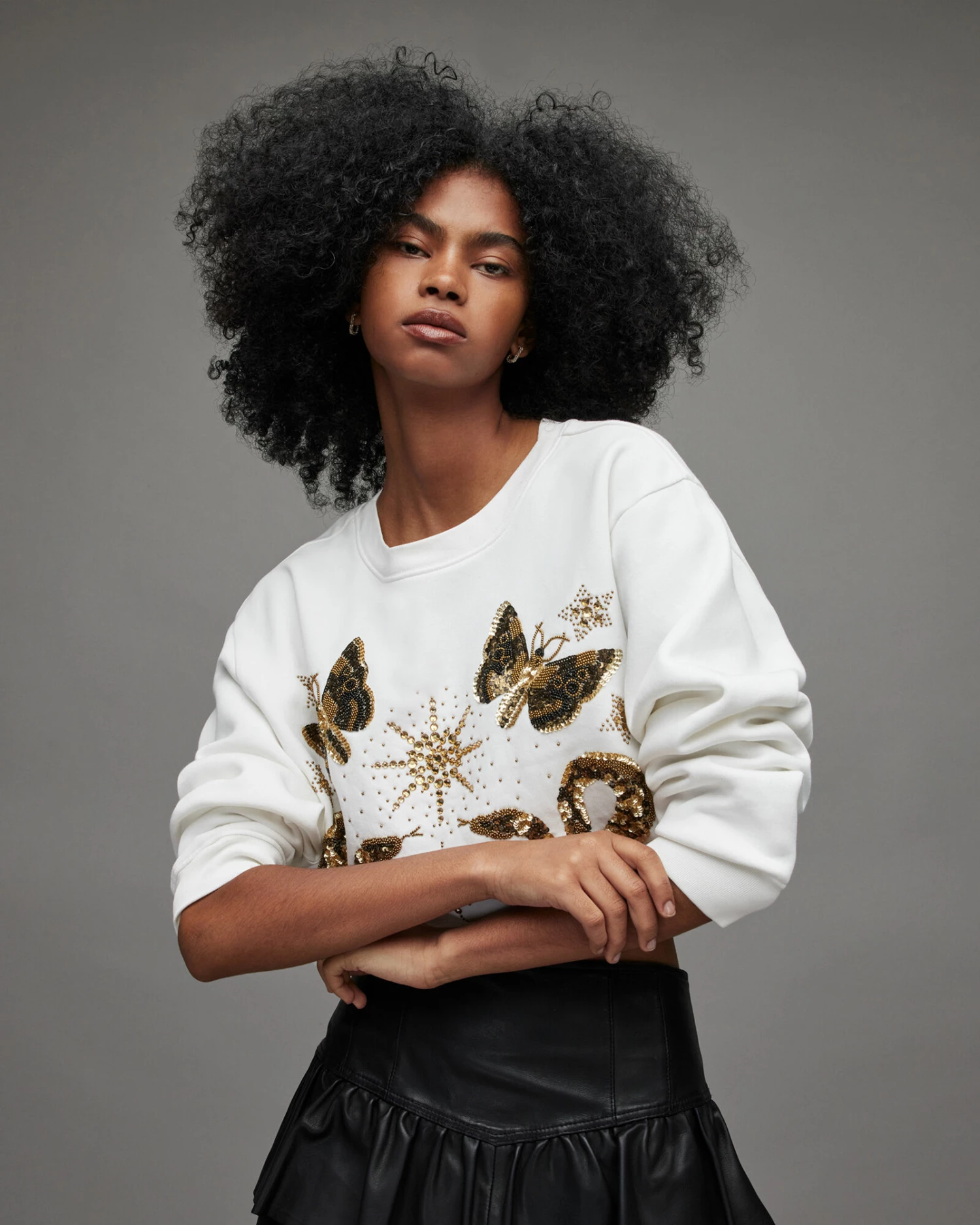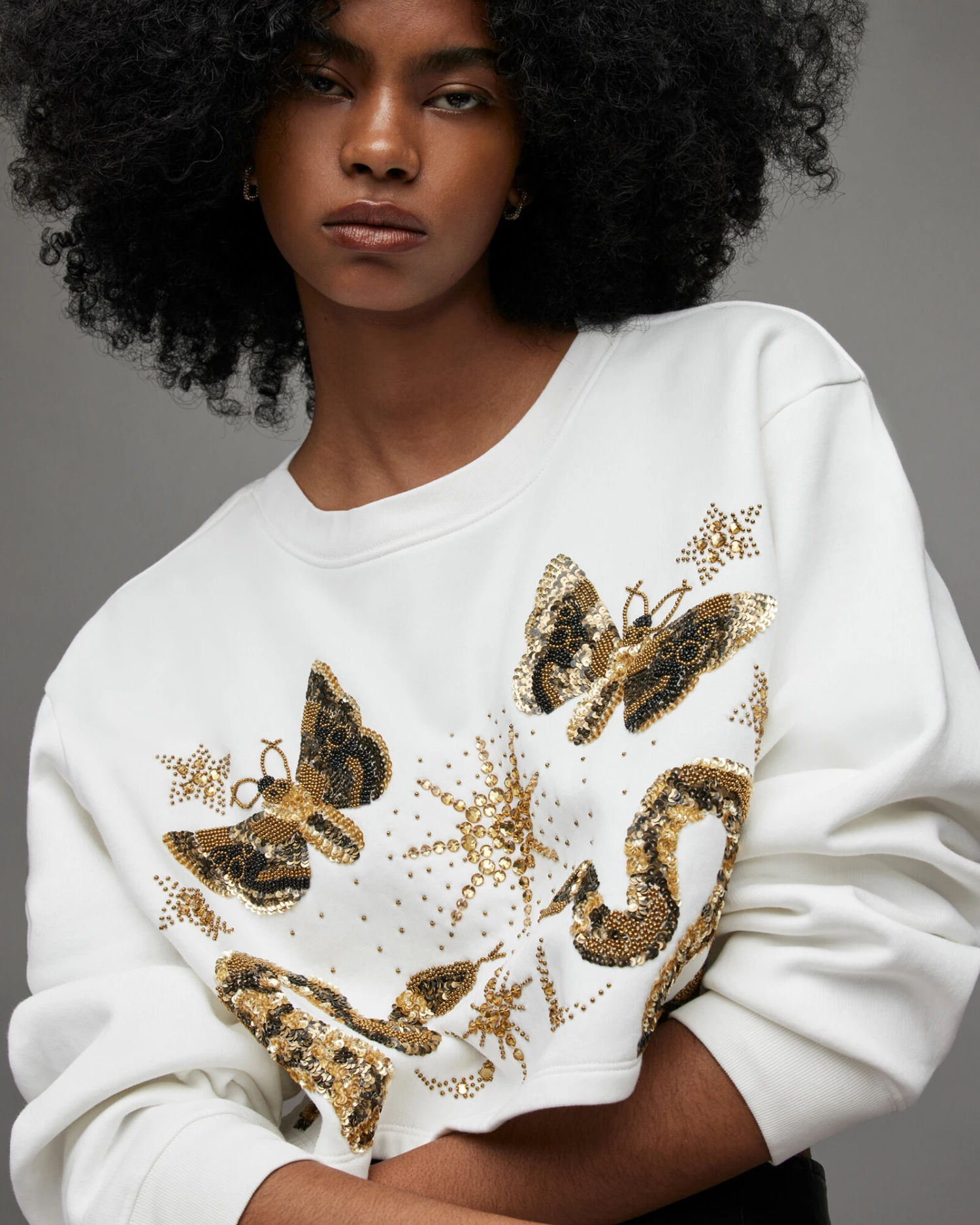 Super comfy and easy to wear. This is the Separo Marina Sweatshirt. It’s shaped to a cropped silhouette. Sequinned embellishment decorates the front – it’s quite the addition.