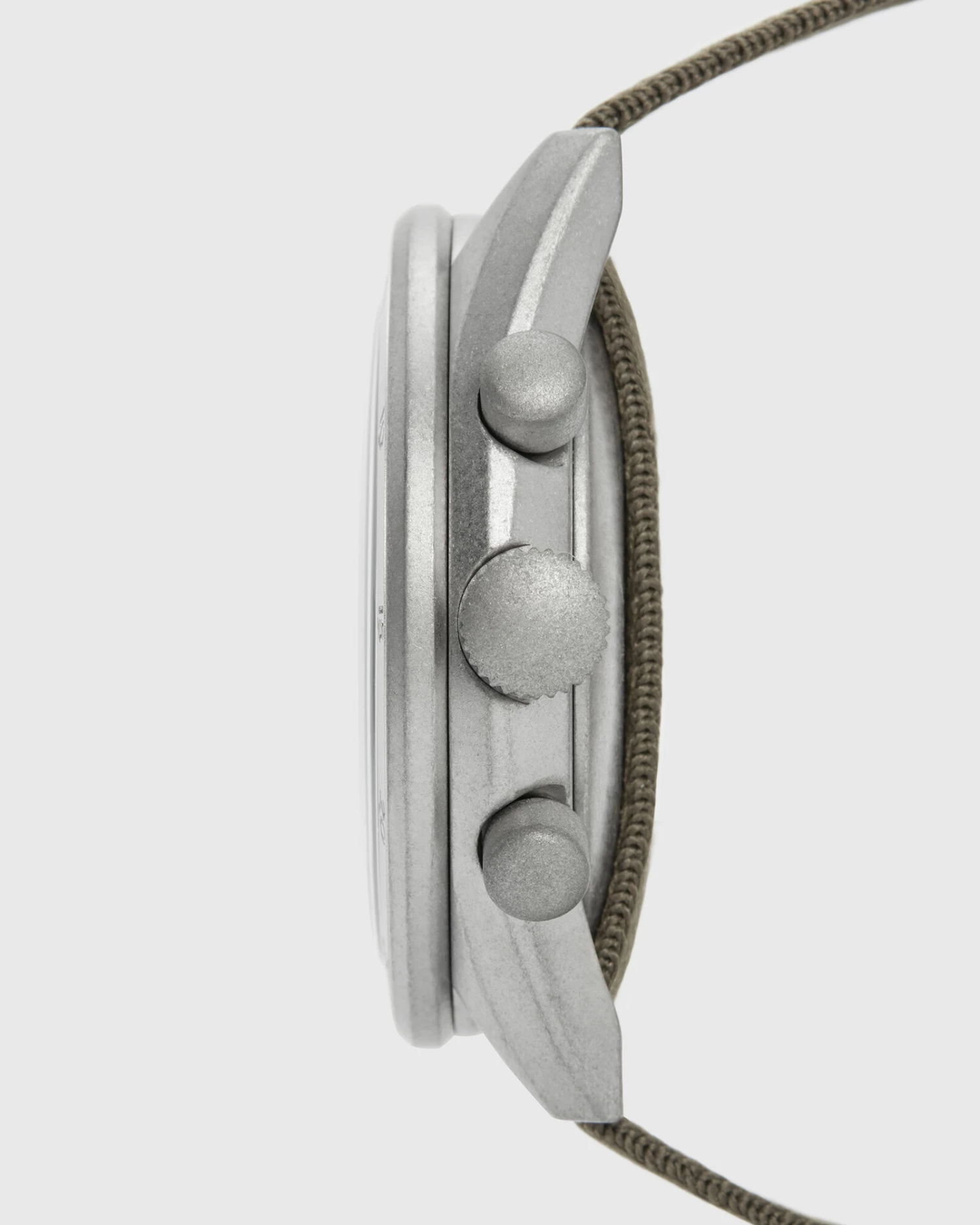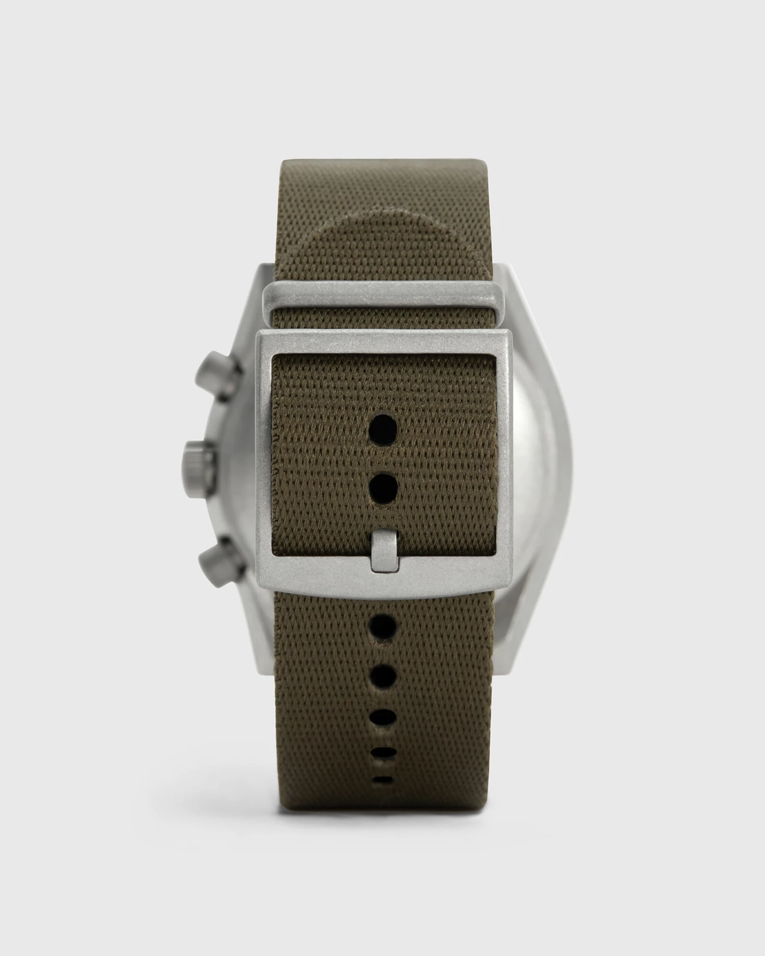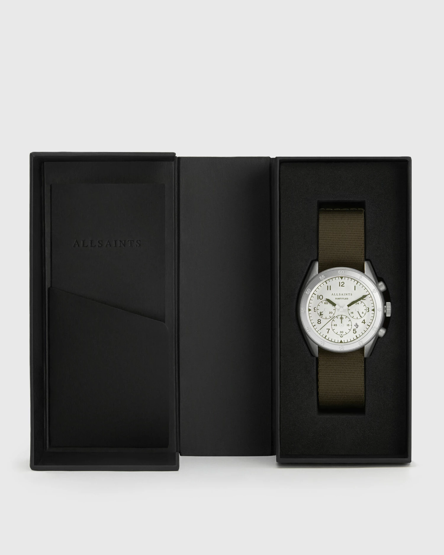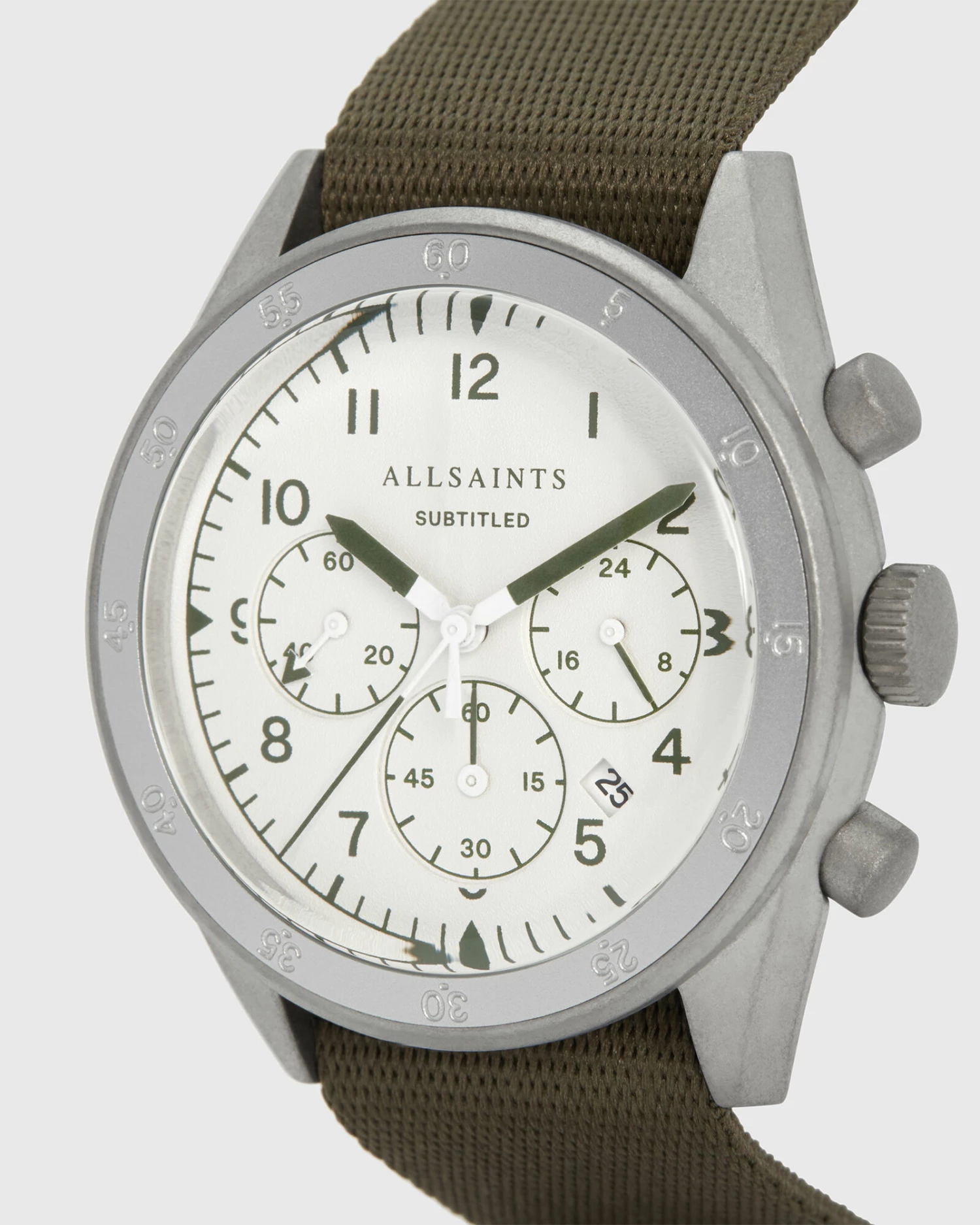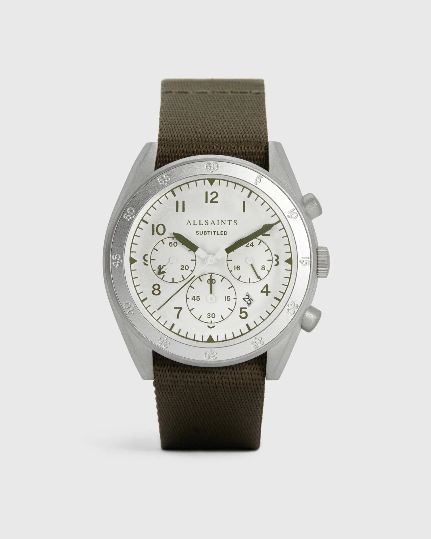 It’s time. The AllSaints debut watch collection is here. Explore the urban landscape with the sporty Subtitled Collection. Subtitled III features a smooth stainless steel case alongside a comfortable military green nylon strap.