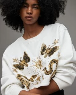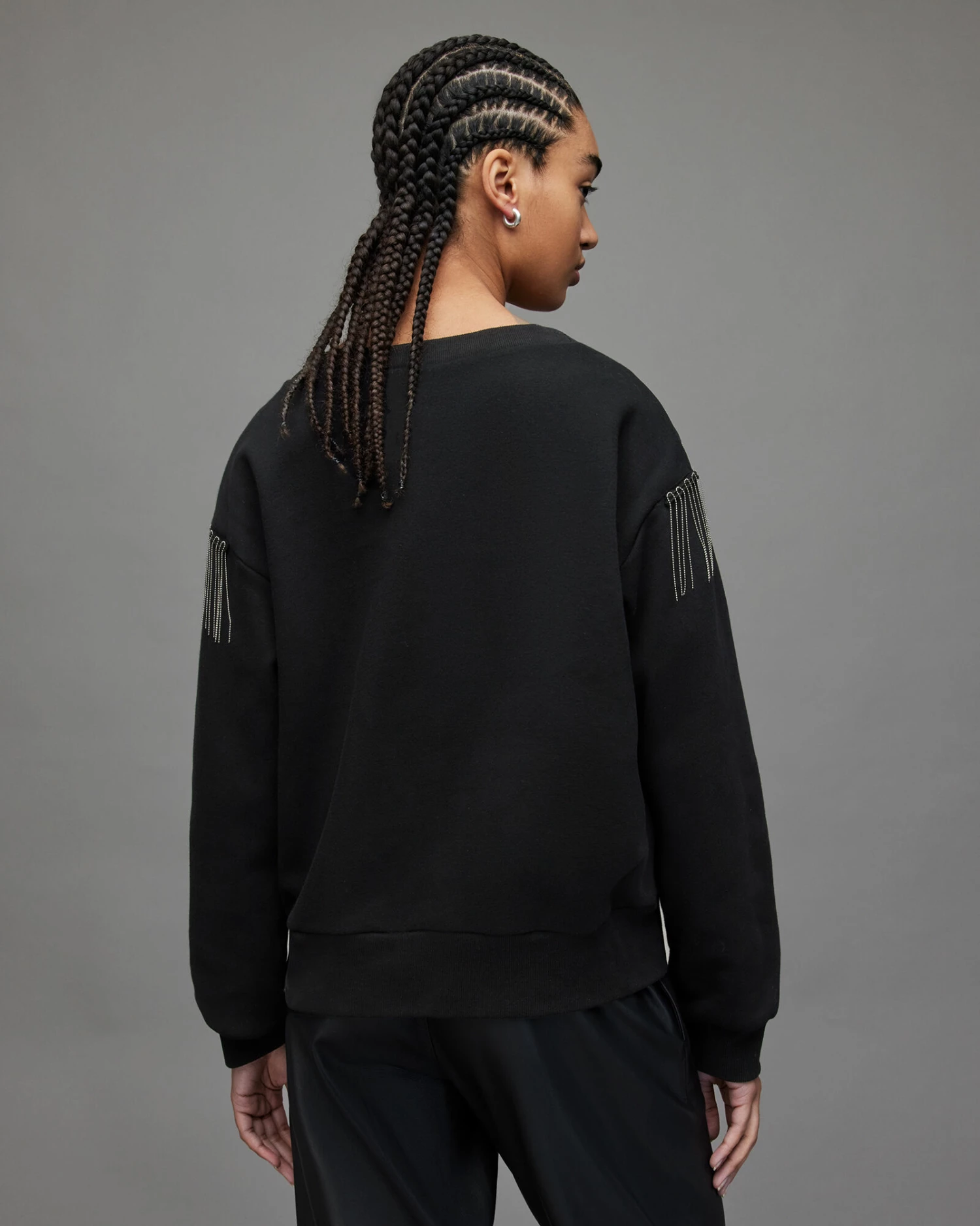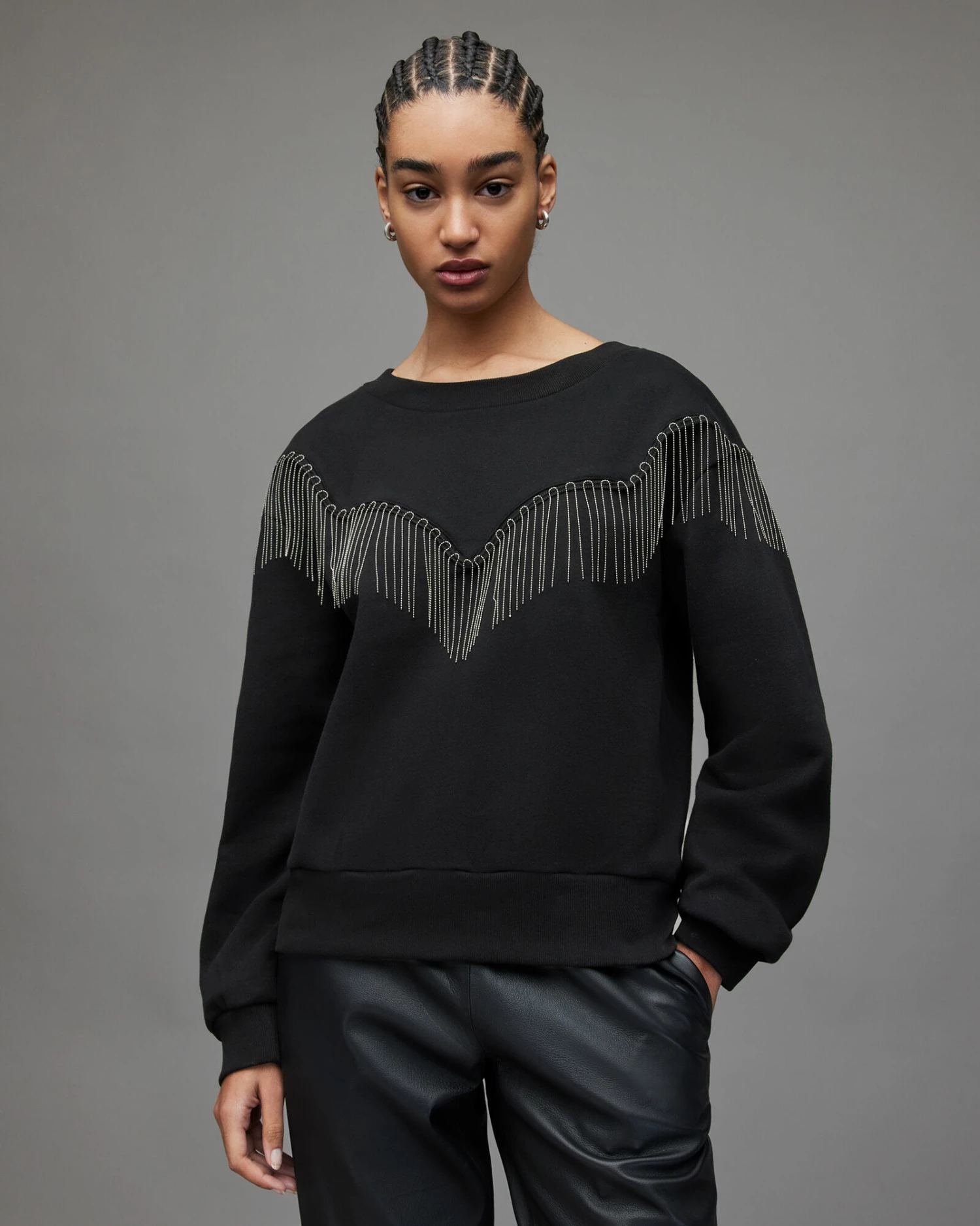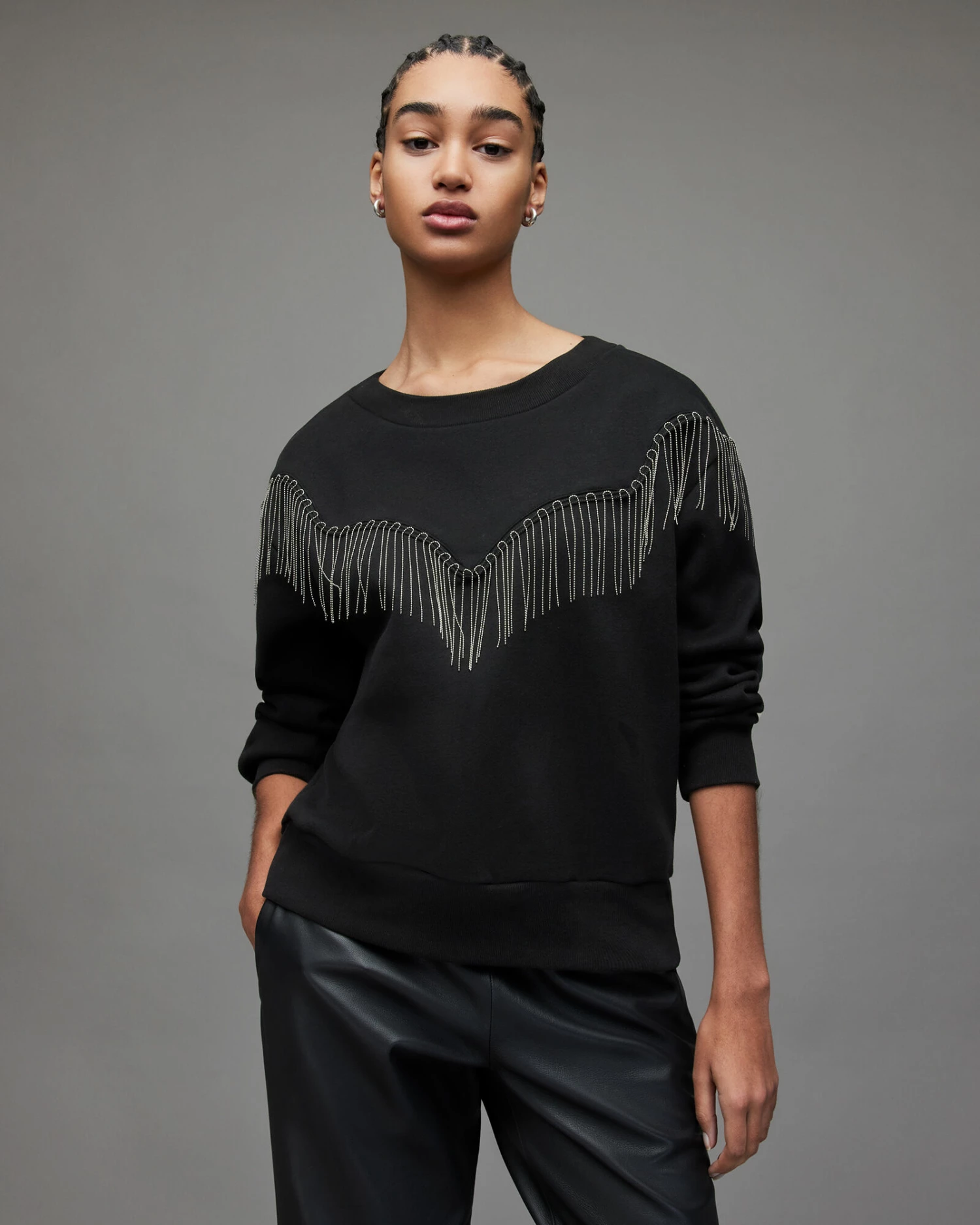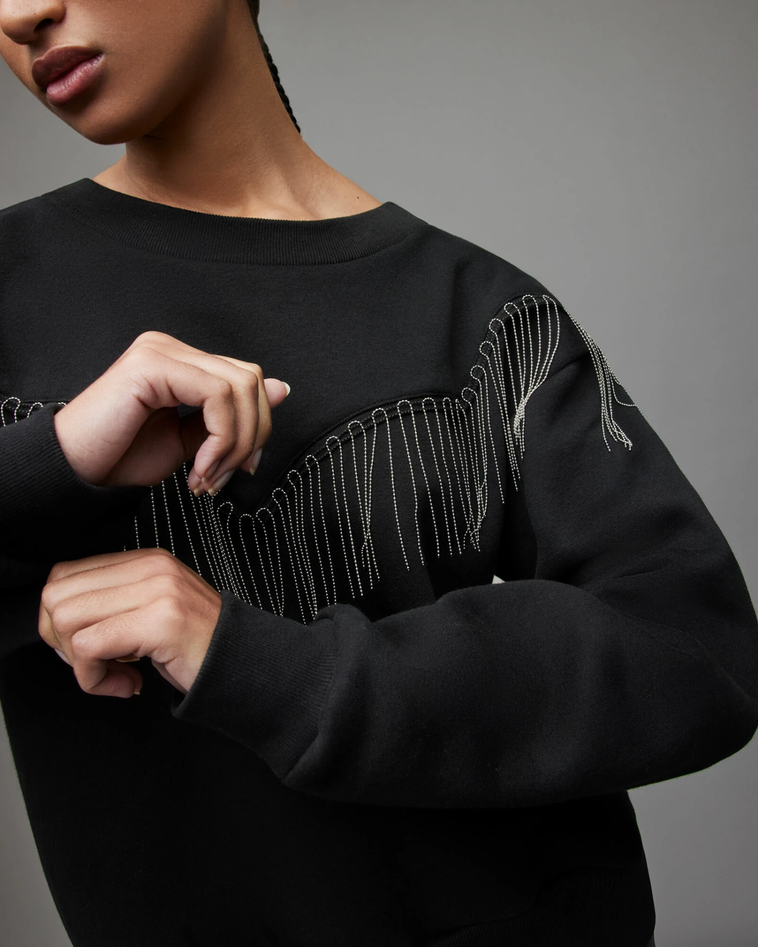 The Tassel Jaine Sweatshirt – it’s got that western vibe. Crafted from a cotton blend fabric in a relaxed silhouette. The fringing sparkles, all across the front.