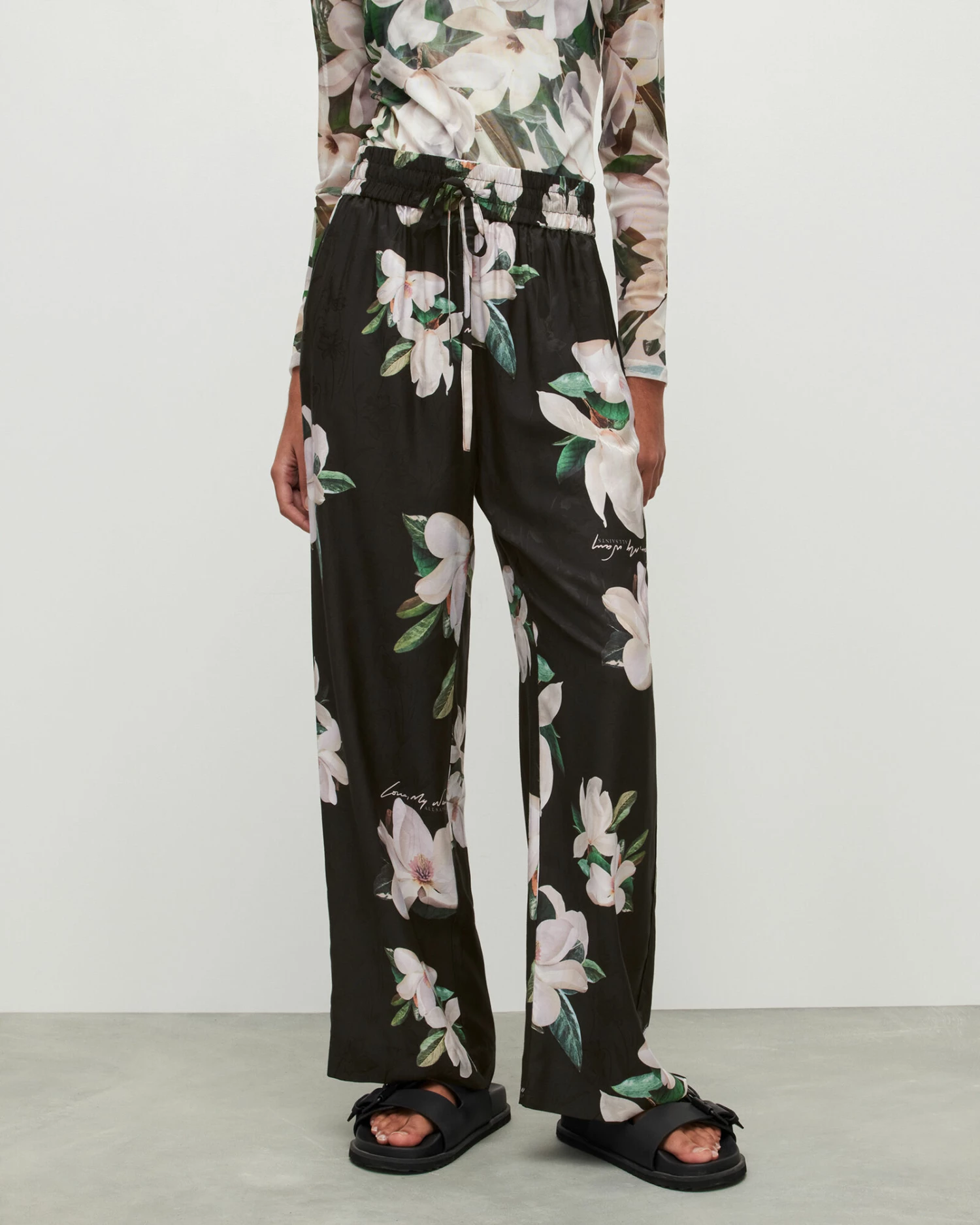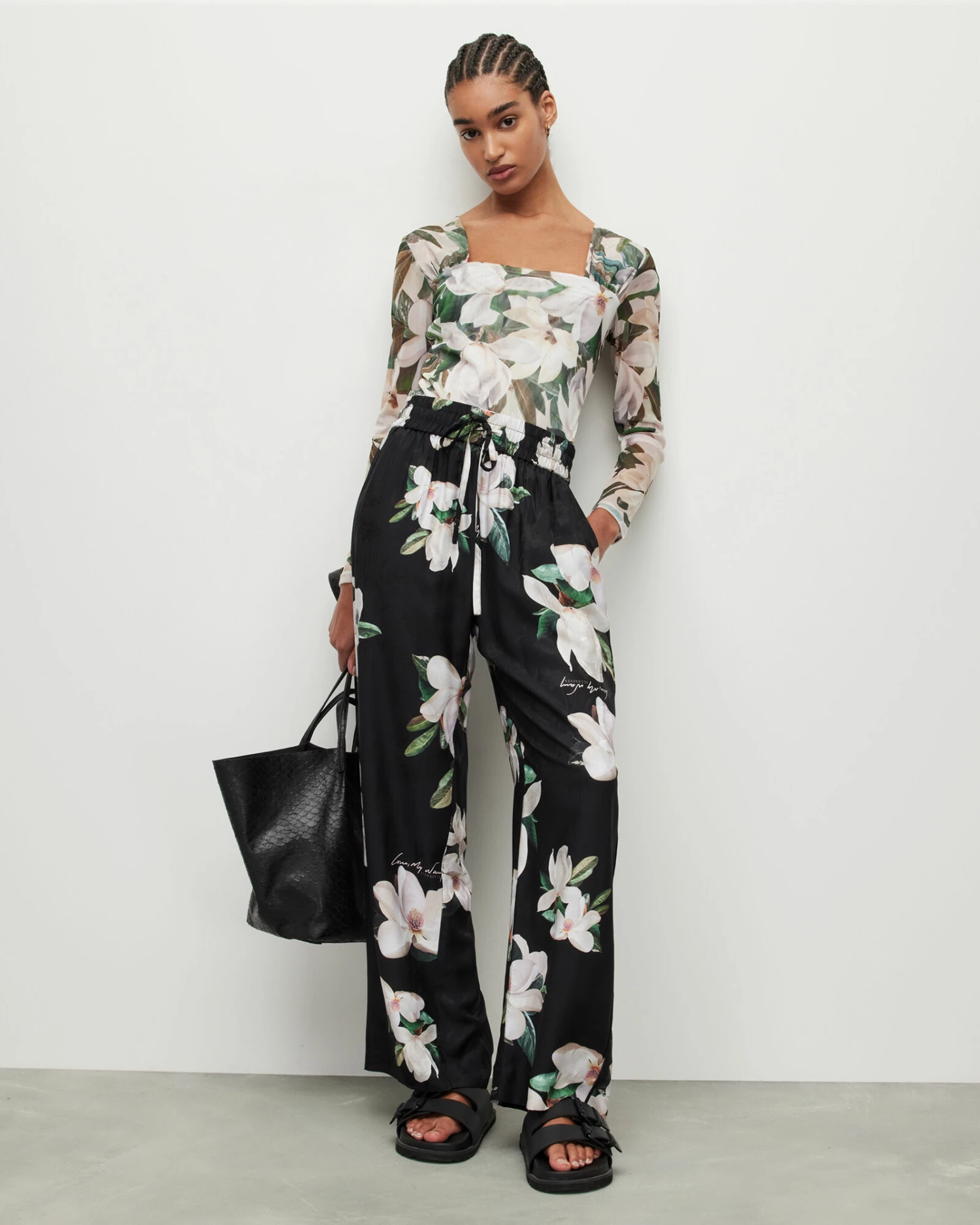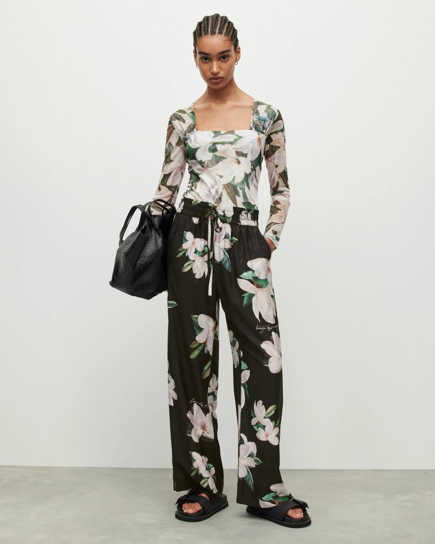 Go with the flow in the Tyler Trousers. Our bright florals sit on a tonal silk-blend base. The high waisted, wide leg silhouette is an easy one – completed with an elasticated drawcord and two pockets.